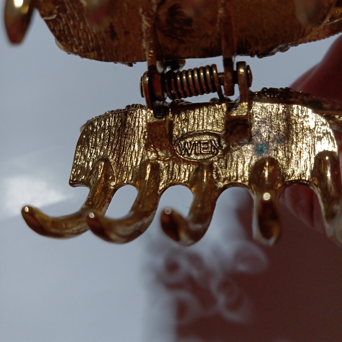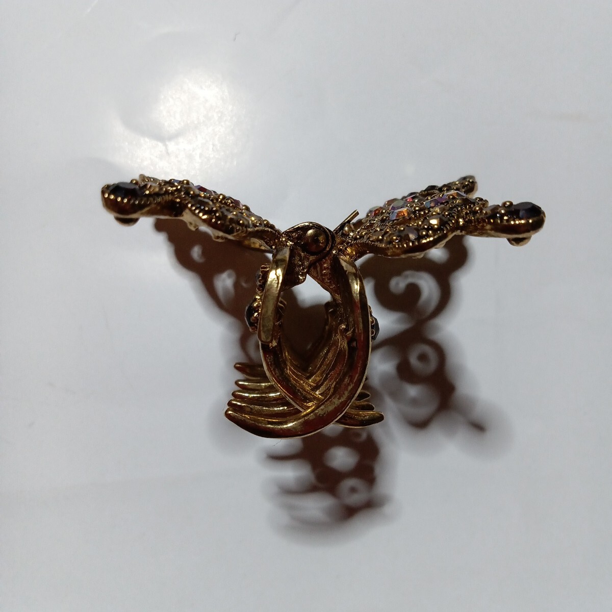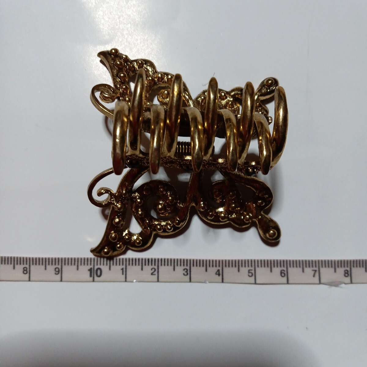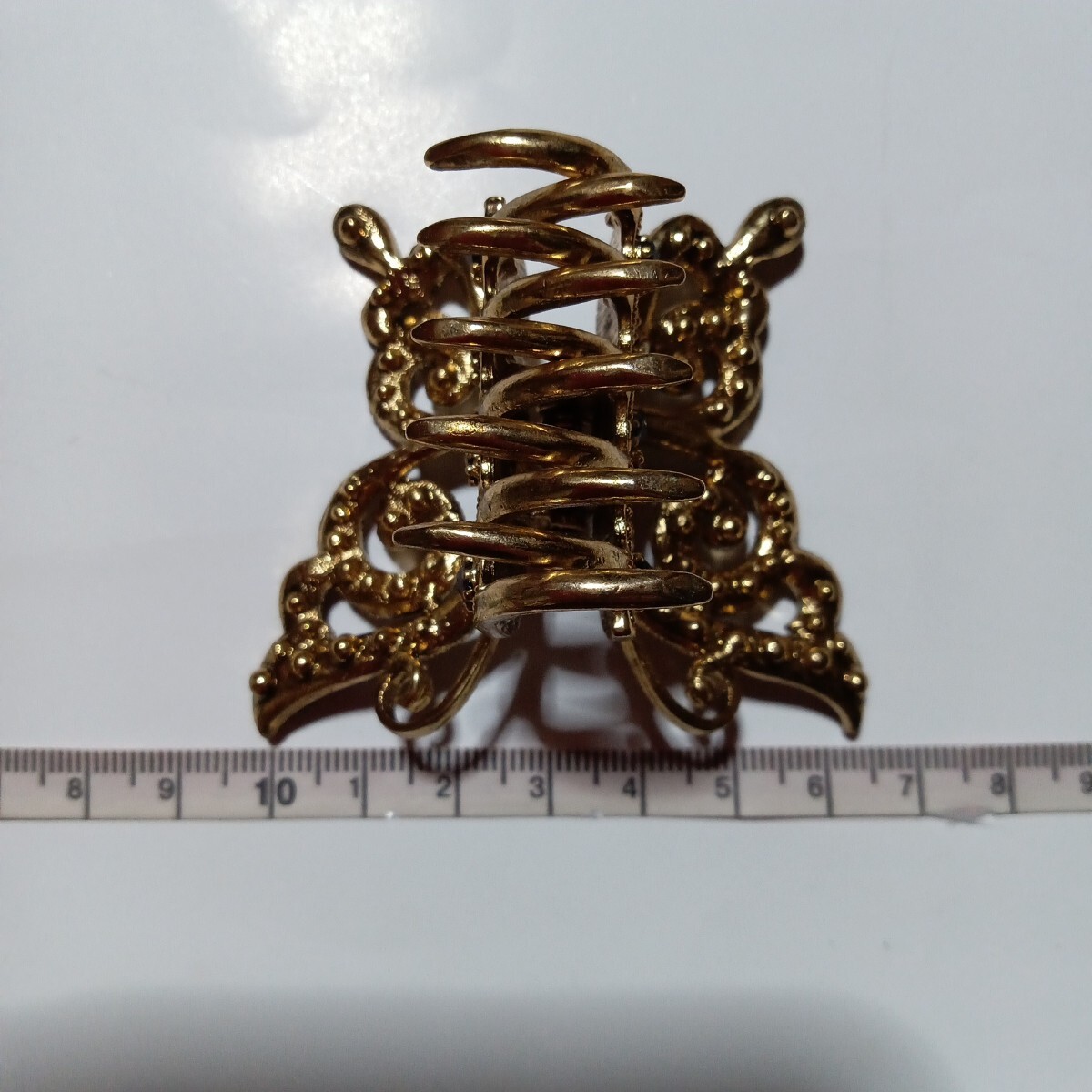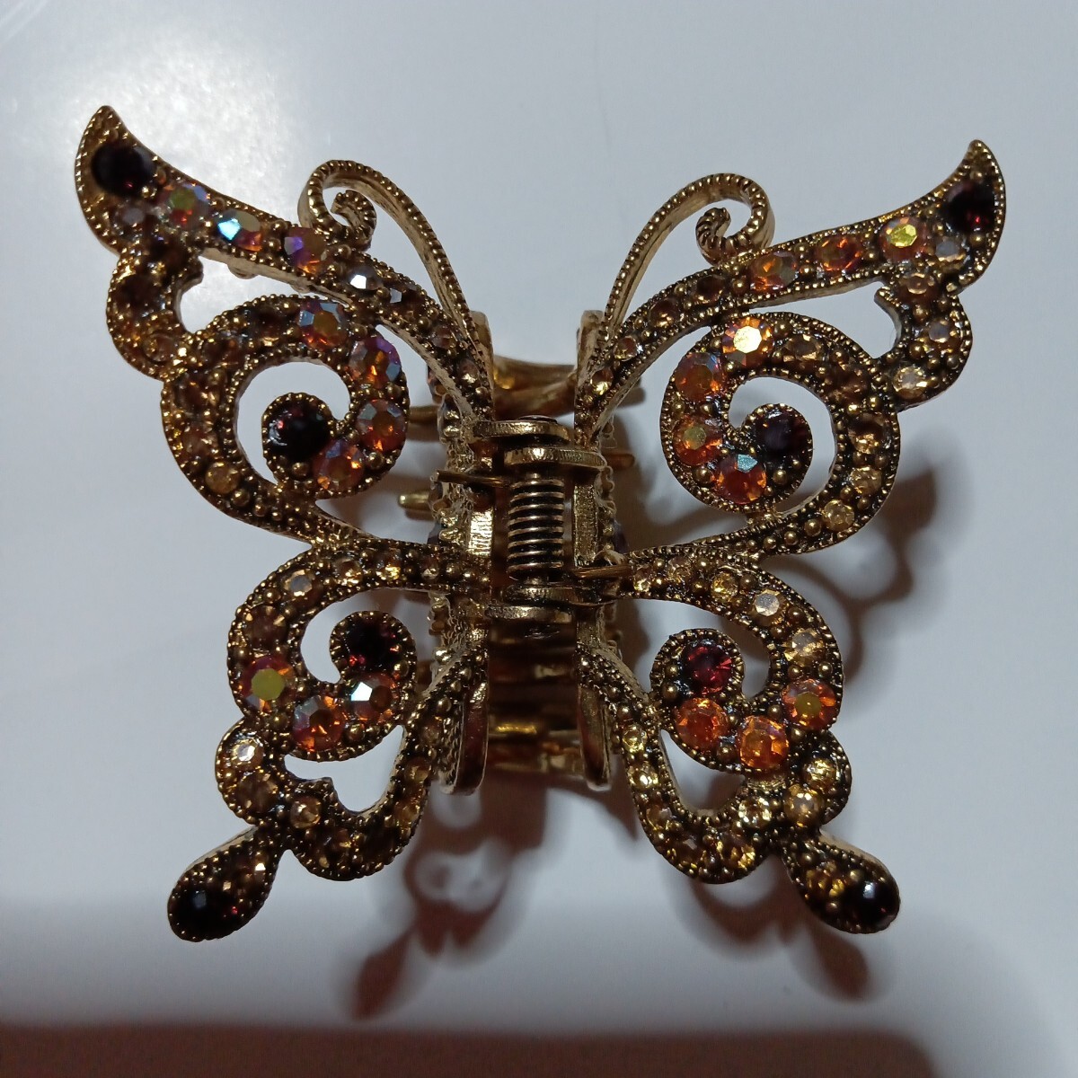 ゴールドカラーのバタフライモチーフに、キラキラの美しいラインストーンが沢山施された、豪華でおしゃれなバンスクリップです。派手さを感じない落ち着いたトーンのゴールドカラーで上品な印象です。とてもしっかりした作りで、確認した所ストーンの落ち等も無さそうです。髪に蝶々が止まったイメージが楽しいヘアアクセサリーです。大事に保管しておりましたが、ご愛用頂ける方にお譲りしたいと思います。