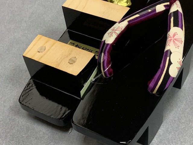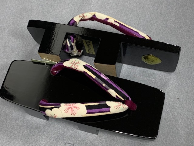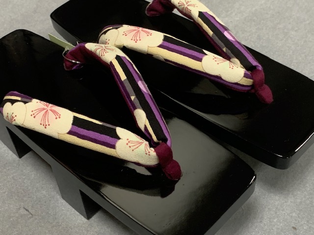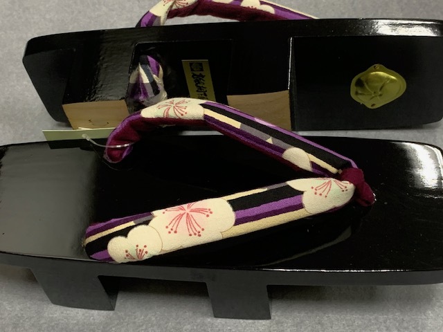 これからの季節に、爽やかな桐下駄、鼻緒もおしゃれな縞に梅の柄 黒塗下駄で高級感があり品格もアップします。
