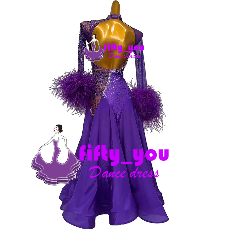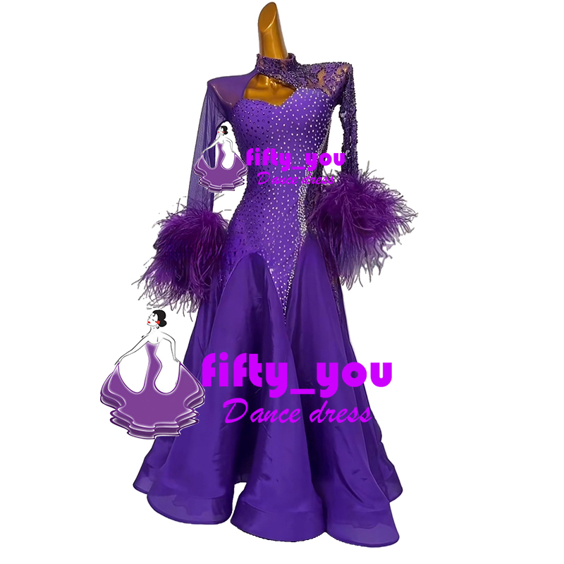 新品fifty_you  社交ダンスドレス サイズオーダー モダン競技パーティドレス ワルツドレス スタンダードドレス 手首ファー飾り 紫色
