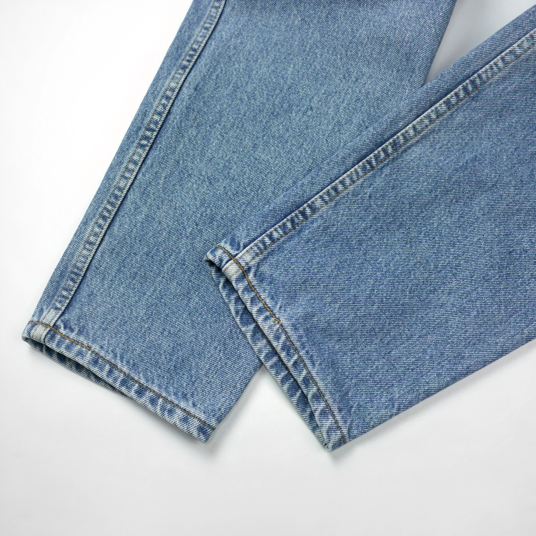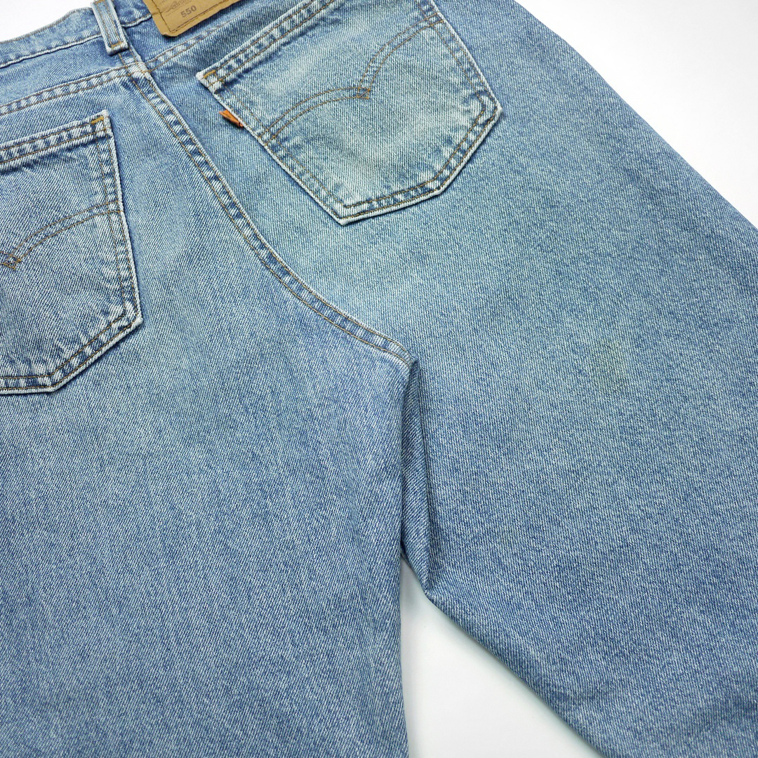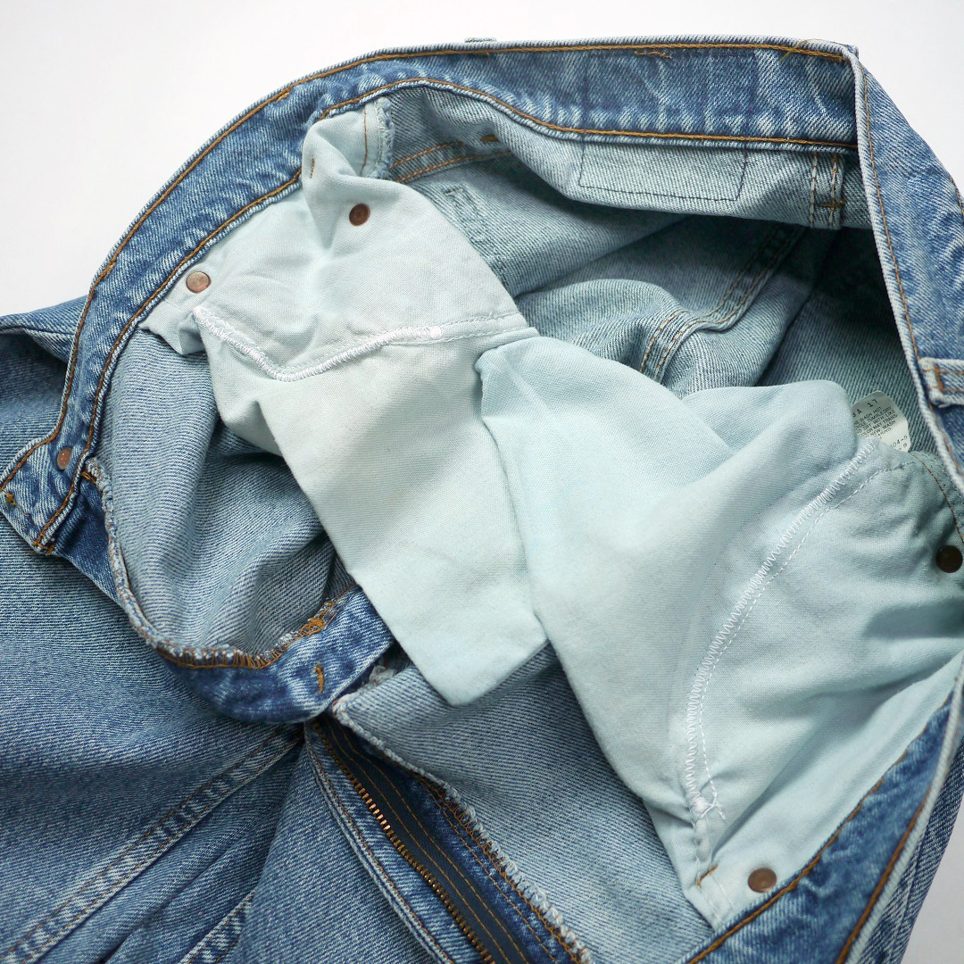 ■ブランド 90s、Levis、40550-0289、MADE IN USA ■カラー 薄青色/ライトブルー ■素材 100% COTTON ■詳細 アメリカで購入したリーバイスの550テーパードジーンズ/デニムパンツです。 90年代(1993年製)、ボタン裏刻印522、アメリカ製のオレンジタブになります。アタリやヒゲなど色落ちも仕上がっておりイイ感じの雰囲気です!! ■状態 デニム特有の色落ち、薄汚れ、アタリ、スレ、スレーキに汚れ、各所フチに多少の摩耗、左右スレーキにリステッチ(通常使用可能)、左下ヒップ&右後モモに薄染みあとあり。 着用に問題あるダメージはなく良好です。 ■サイズ 表記 W32 L32(実寸W31.5 L31.5 *下記参考下さい) ウェスト 40cm×2 股下 80cm 総丈 107cm 裾幅 17cm 股上前 31cm 股上後 40cm ヒップ 52cm ワタリ 32cm ■注意事項 状態は細かく確認しておりますが、傷や汚れの見落とし、実寸誤差、色味差異など生じる場合がございます。 不明な点がありましたら入札前にご質問下さい。 商品にあわせて洗濯やクリーニングメンテナンスを施しておりますが、ビンテージやアンティークなど中古品になりますので特性のご理解をお願いします。 |