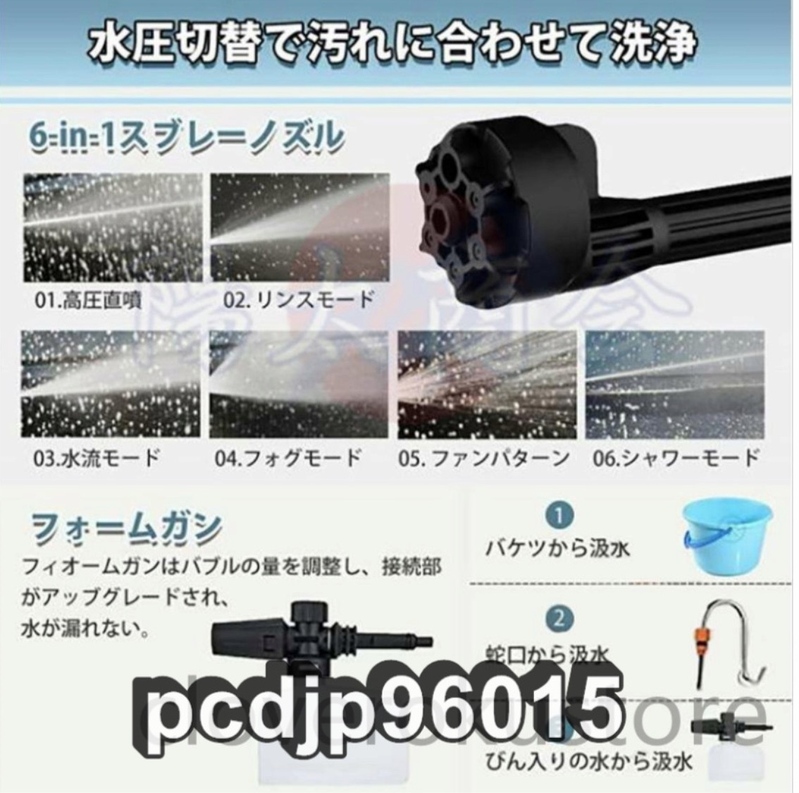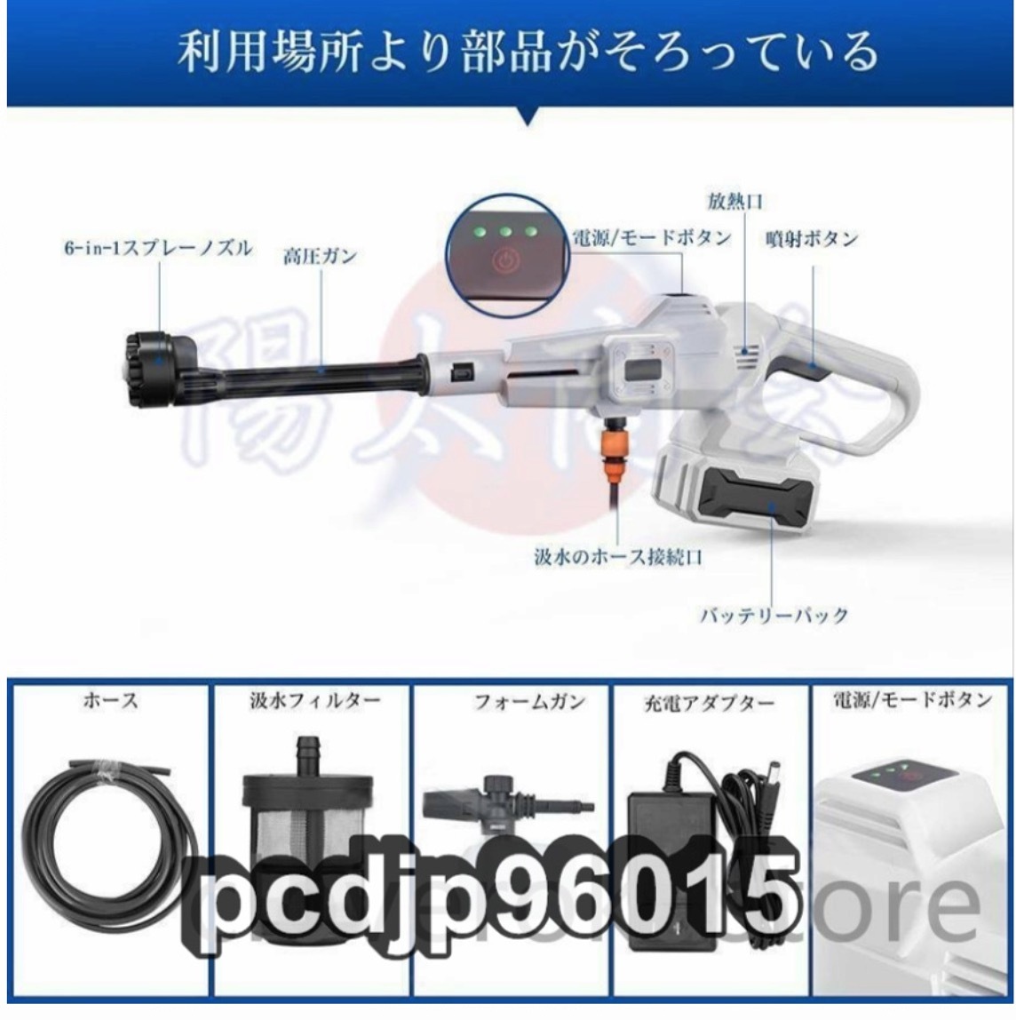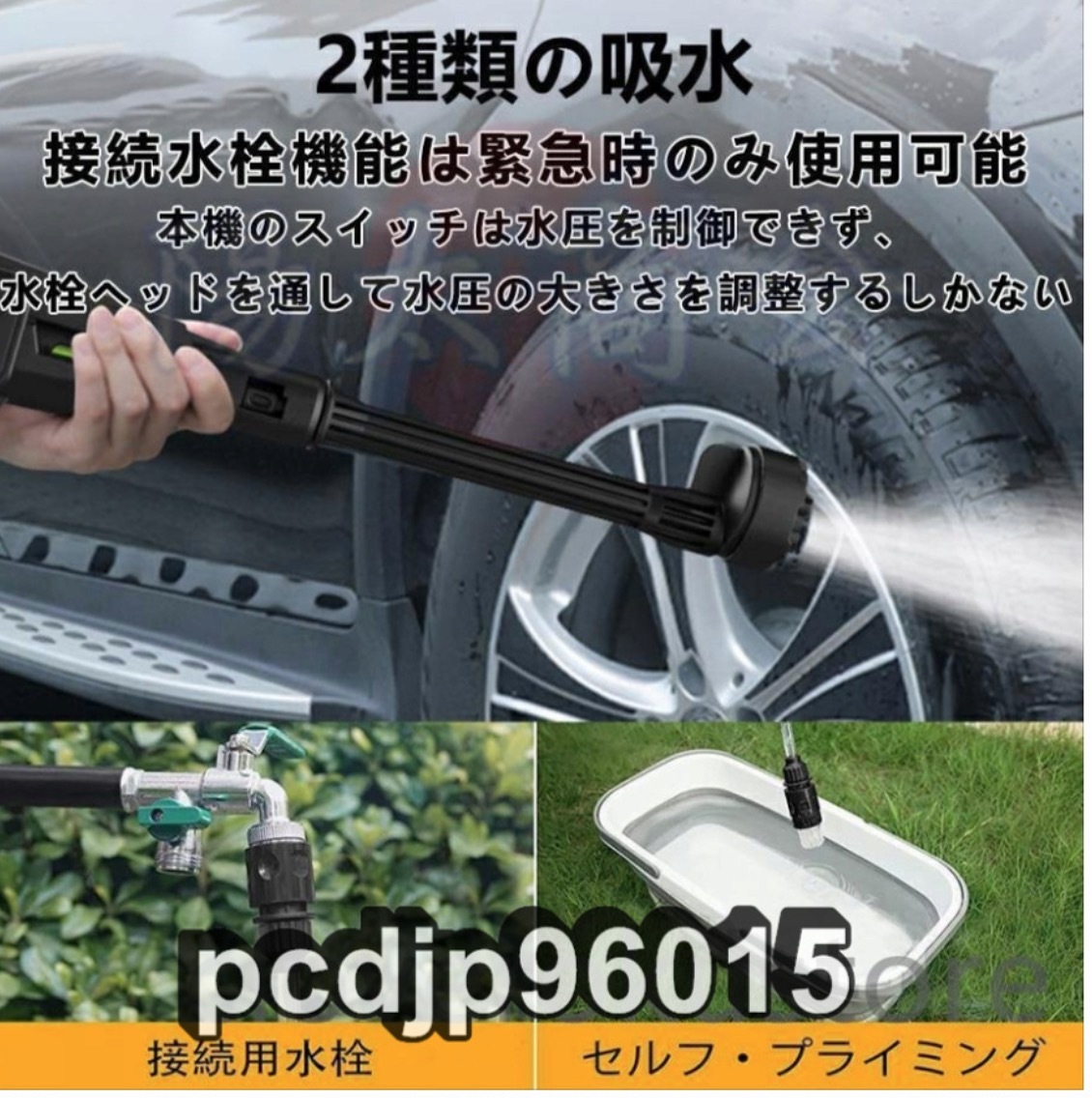 ★電源:コードレス式 ★給水方式:自動吸水式(専用高圧ホース(5m)&ボトル用コネクター付き) ★3段階パワーモード切り替え可 ★高圧水洗機サイズ:約61×19cm ★本機重量:980g (バッテリー&アクセサリーを含めない) ★ケース重さ:2.7kg(本体、バッテリー、アクセサリーを含む) ★MAX吐出圧力:50bar/5MPa ★MAX吐出水量:228L/h ★使用水温度範囲:0~50℃ ★モーター出力:230W ★材質:ABS、アルミ、ポリエチレン ★セット内容:洗車高圧ガン本体*1、収納ケース*1、6in1多機能マルチノズル*1、バブルボトル用ノズル*1、フィルタ*1、給水ホース*1、バッテリーと充電器*1 ★この水道直結機能は緊急時に使用するためのもので、例えば電気がない場合や電力が不足している場合には水道管を直接リンクすることができます。 ★商品写真はできる限り実物の色に近づけるよう努めておりますがご使用のPCモニター設定や部屋の照明により多少、色の変化が感じられる場合がございます