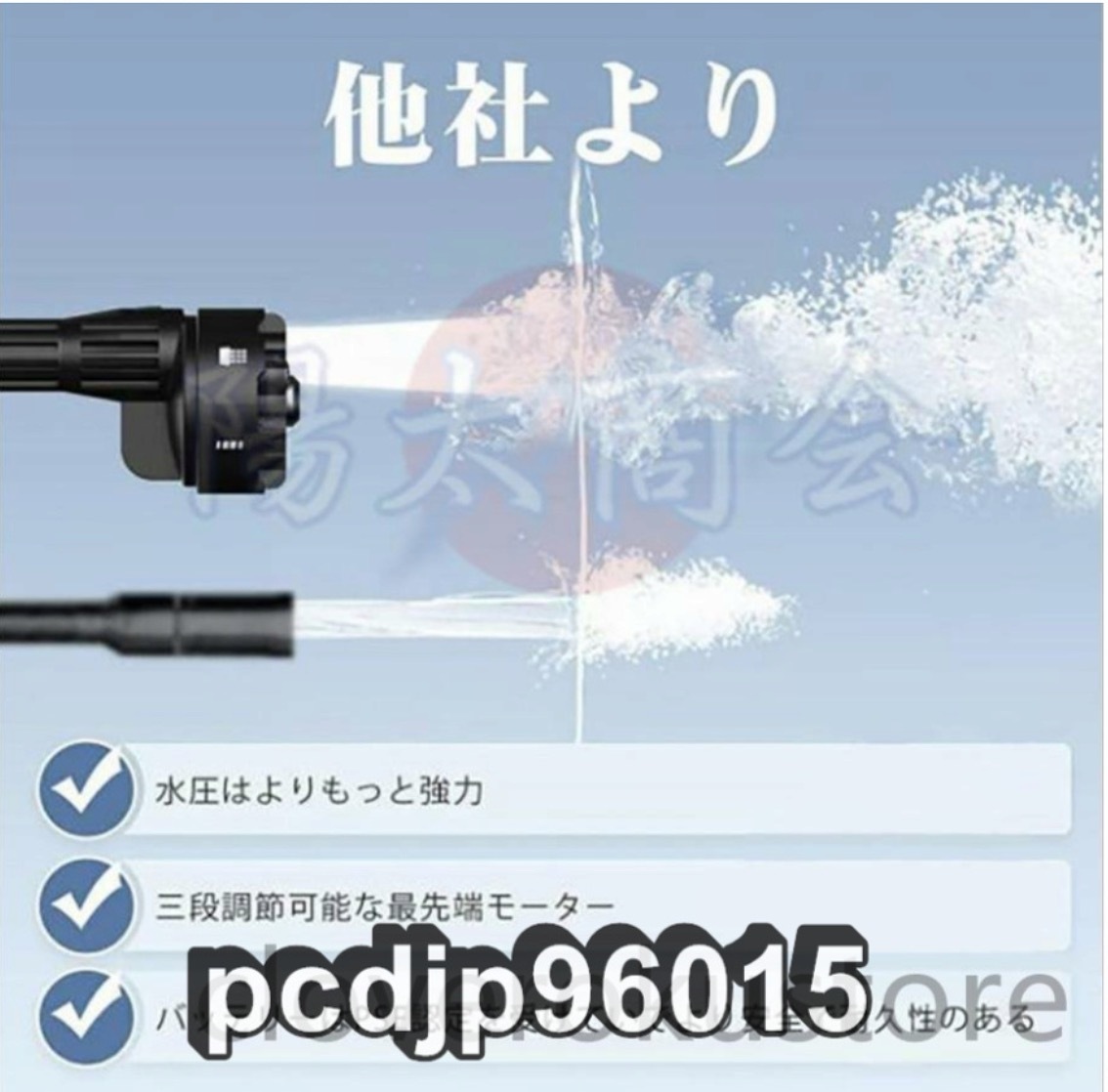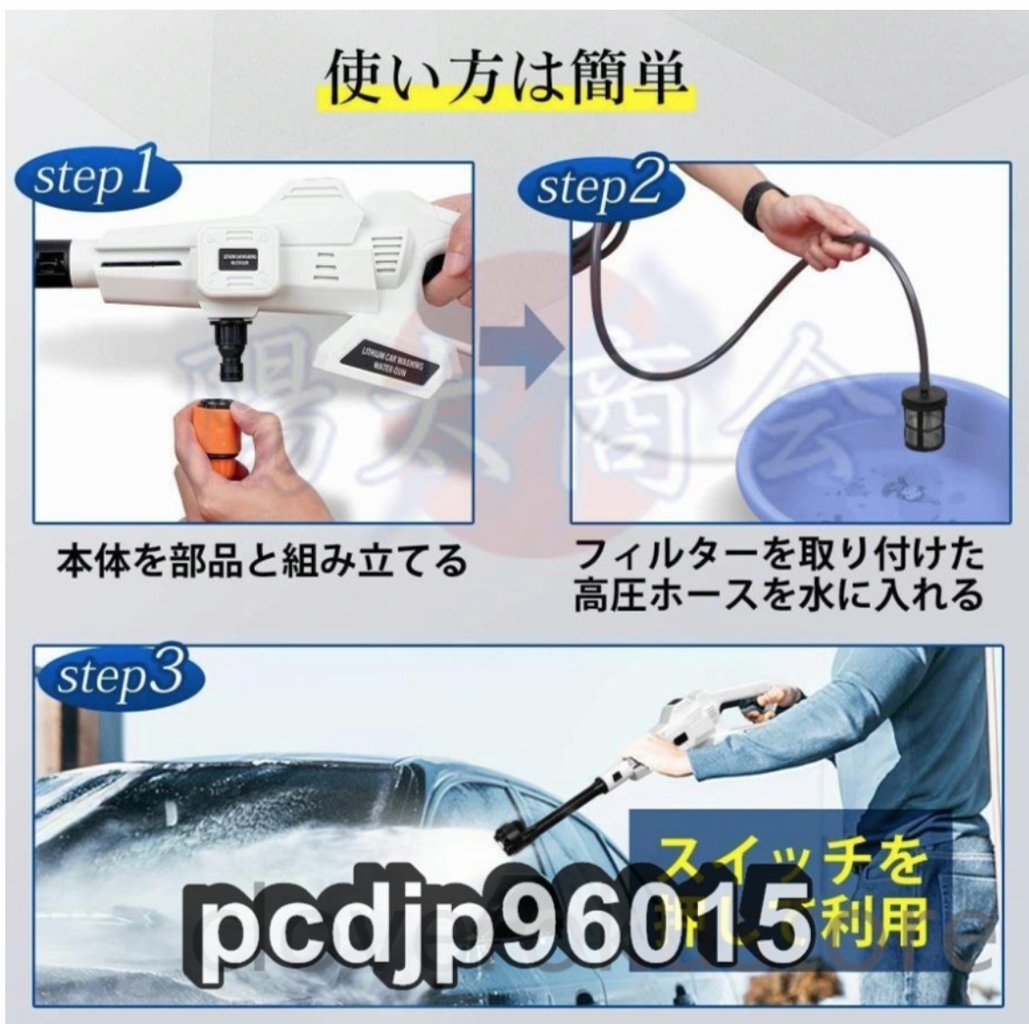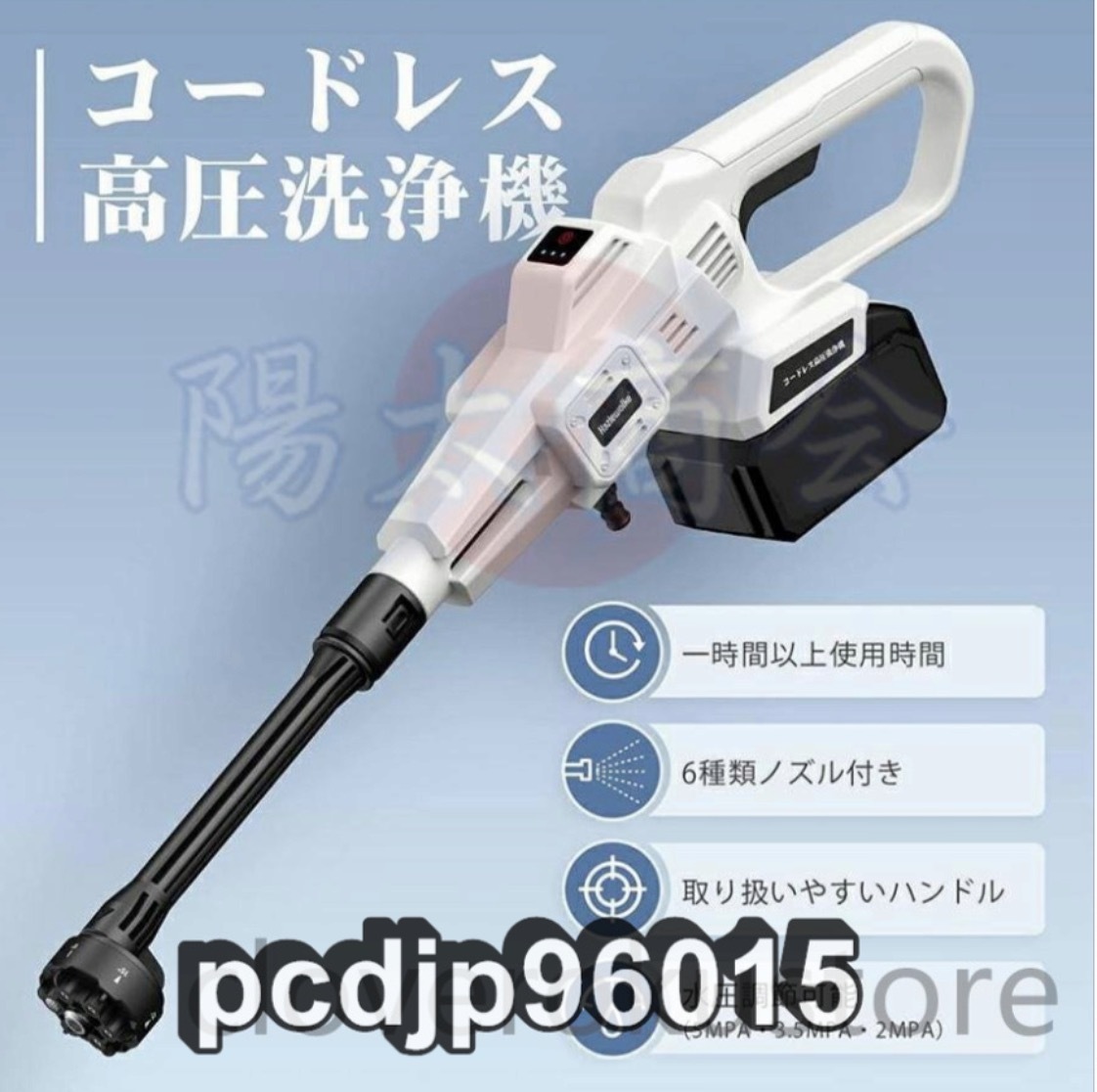★電源:コードレス式 ★給水方式:自動吸水式(専用高圧ホース(5m)&ボトル用コネクター付き) ★3段階パワーモード切り替え可 ★高圧水洗機サイズ:約61×19cm ★本機重量:980g (バッテリー&アクセサリーを含めない) ★ケース重さ:2.7kg(本体、バッテリー、アクセサリーを含む) ★MAX吐出圧力:50bar/5MPa ★MAX吐出水量:228L/h ★使用水温度範囲:0~50℃ ★モーター出力:230W ★材質:ABS、アルミ、ポリエチレン ★セット内容:洗車高圧ガン本体*1、収納ケース*1、6in1多機能マルチノズル*1、バブルボトル用ノズル*1、フィルタ*1、給水ホース*1、バッテリーと充電器*1 ★この水道直結機能は緊急時に使用するためのもので、例えば電気がない場合や電力が不足している場合には水道管を直接リンクすることができます。 ★商品写真はできる限り実物の色に近づけるよう努めておりますがご使用のPCモニター設定や部屋の照明により多少、色の変化が感じられる場合がございます