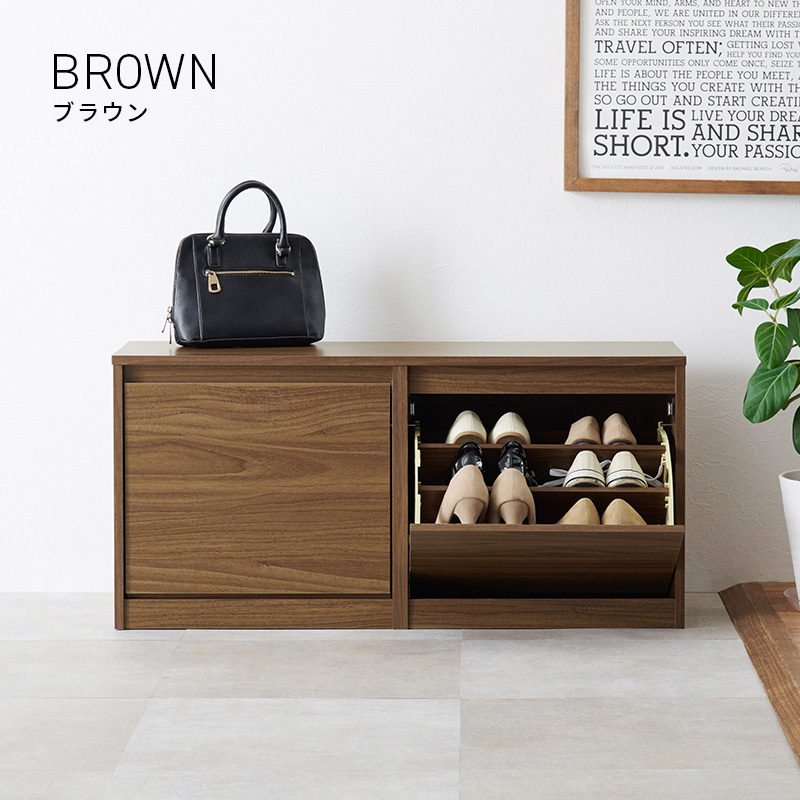 フラップ式のシューズラック機能を備えた玄関ベンチ。