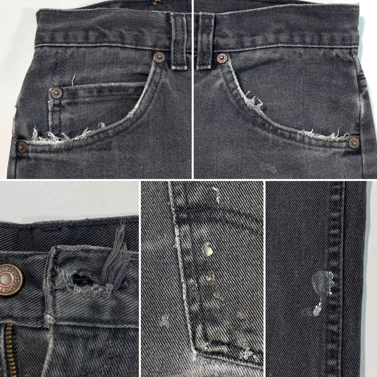 裾や前後ポケットなどに擦れ、フロントのボタンホールに破れがみられます。所々に白いペンキのような汚れがありますが、まだまだ着用していただけます。