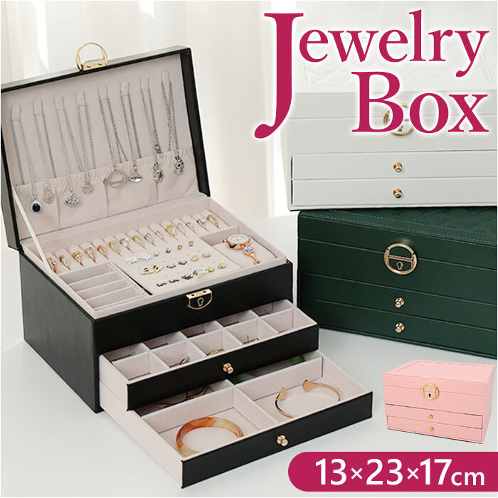 商品説明 | ・・お気に入りのアクセサリーをスッキリと収納できる、3段ジュエリーボックス♪ ・【見やすくたっぷり収納!】 ・なくしがちなアクセサリーをまとめて整理整頓◎ ・【ワンタッチ開閉】 ・開口部のリング状金具を上げるだけで簡単オープン。戻す時は、カチッと鳴るまで下げるだけ。 ・【鍵付きで安心】 ・大切なアクセサリーを保管するのに最適◎ ・【傷付きを防止】 ・柔らかな起毛素材の底面内張り仕様。 ・《上部の収納スペース》 ・【出し入れがスムーズ】 ・パカッと大きく開いてサッと出し入れOK♪ ・【ネックレス収納】 ・フタ裏にネックレスを8本掛けられる!チェーンが絡まず収納できるギャザーポケット付き。 ・【指輪収納】 ・リング収納スロット×15を配置。 ・【ピアス収納】 ・扉状プレートに合計15組のピアスを収納。取り外し可能な5つ穴&4スリット付きのプレートも装備。 ・【フリースペース】 ・扉状プレート下部に9個に仕切られたボックスを装備。 ・【腕時計】 ・いつも身に着ける腕時計を1本収納可能。クッションパッドが1つ付属。 ・《引き出し1段目》 ・【イヤリングやミニブローチ】 ・・20個に仕切られたボックスに見やすく収納! ・《引き出し2段目》 ・【バングルなど大ぶりのアイテム】 ・仕切りパーツを使って、4つのスペースに仕切ることが可能。 |