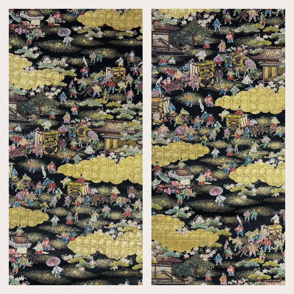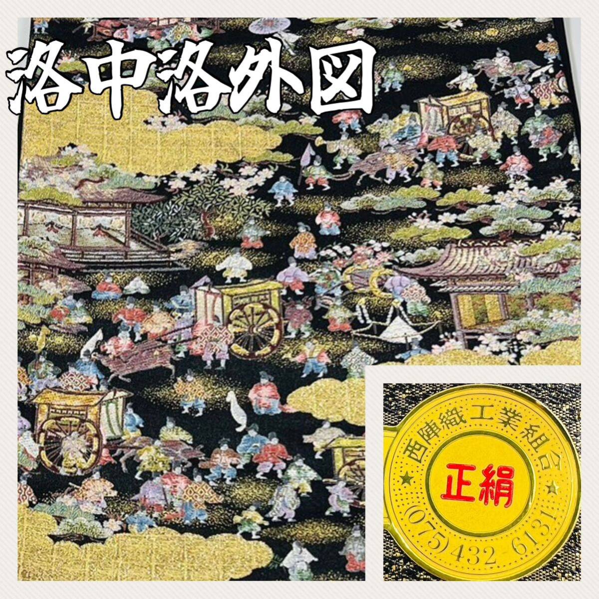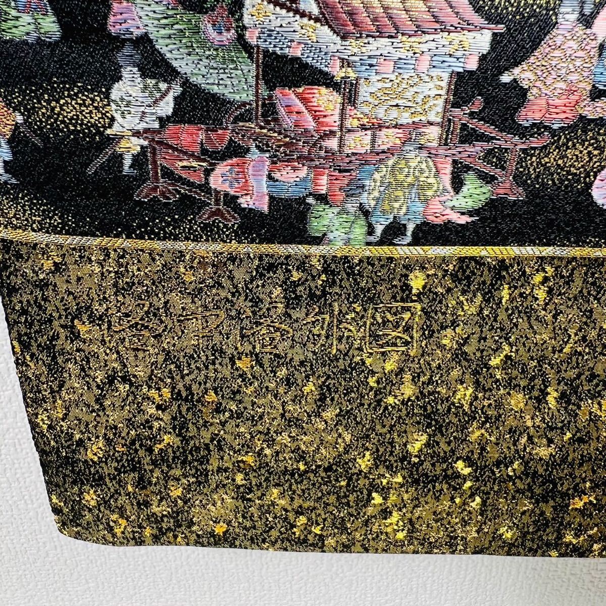 帯 洛中洛外図 壱千八百口織 西陣織 正絹 おび 刺繍 にしじんおり 金 黒 人