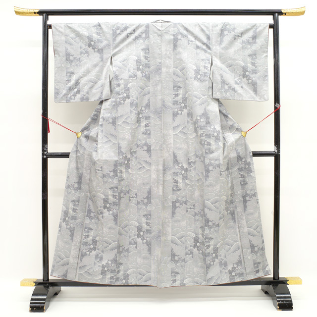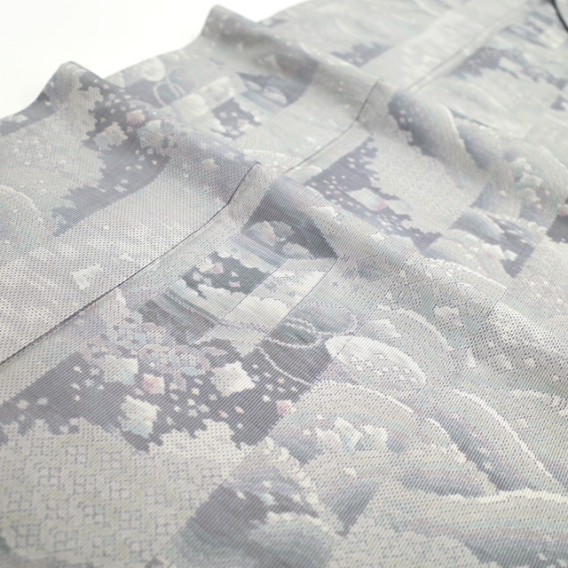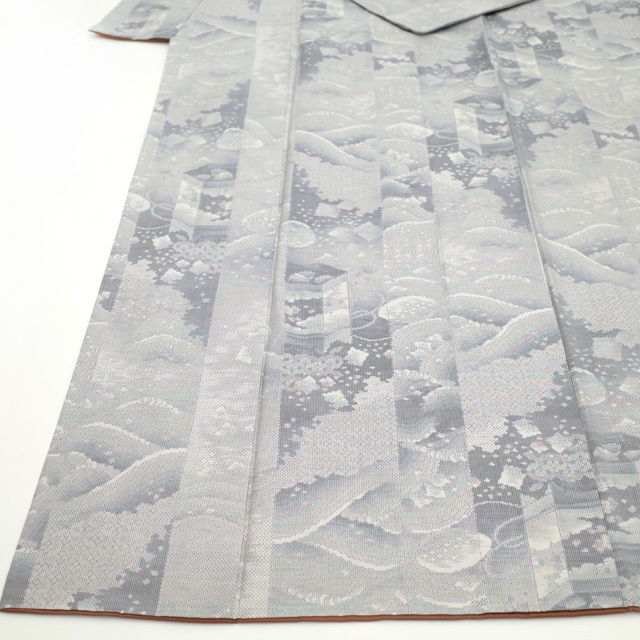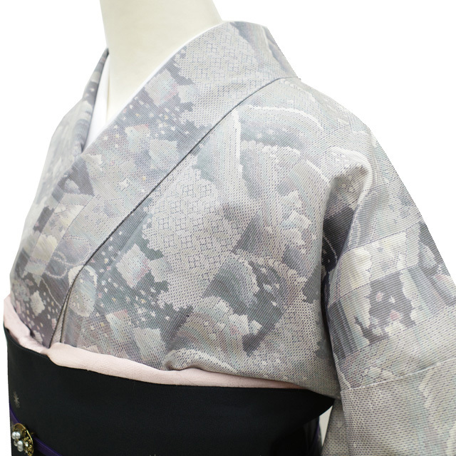 こちらのお着物は、ライトグレーや紫で 貝桶や貝合わせ・七宝 などが織り上げられています。