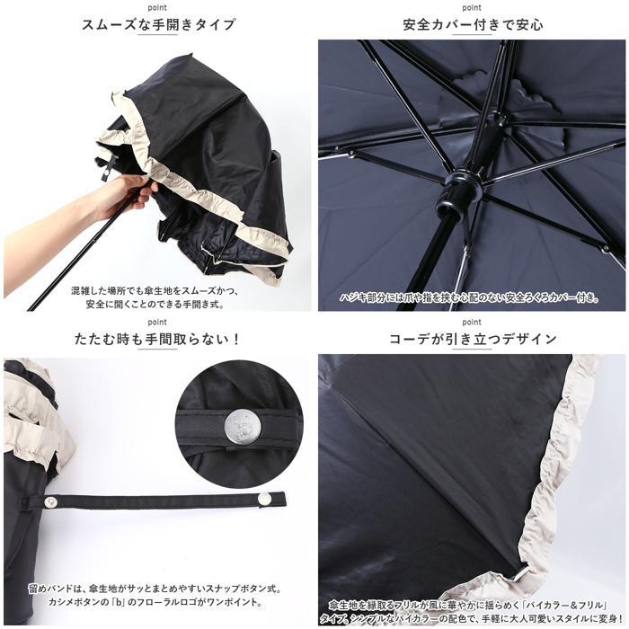 ・留めバンドは、傘生地がサッとまとめやすいスナップボタン式。カシメボタンの「b」のフローラルロゴがワンポイント。