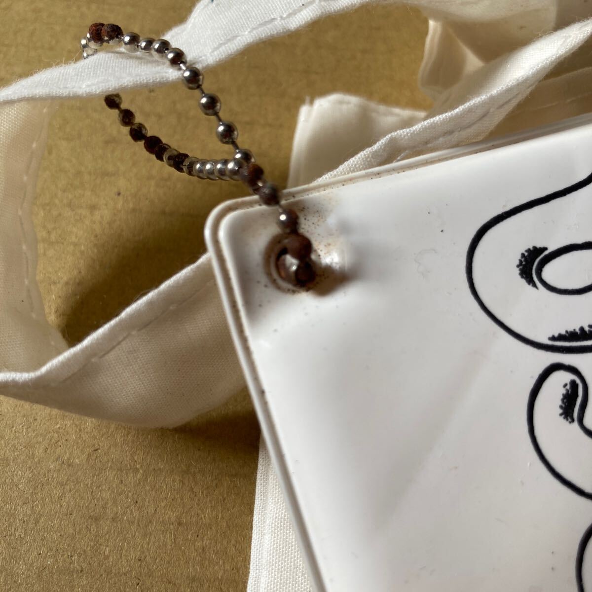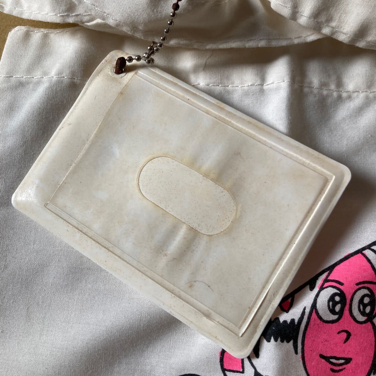 イラスト上部に大きくシミヨゴレあります。無地裏面もヨゴレあります。カードホルダーのチェーン錆あり、またカードホルダーもヤケあります。画像をよくご確認の上でご入札ください。