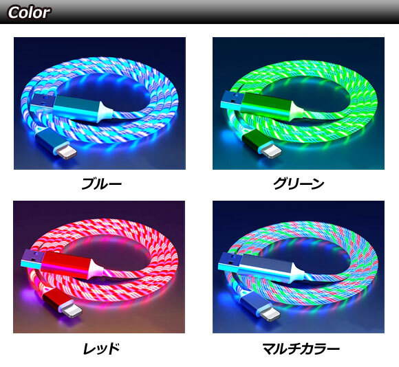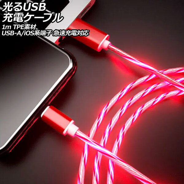 光るUSB充電ケーブル レッド 1m TPE素材 USB-A/iOS系端子 急速充電対応 AP-UJ1056-RD