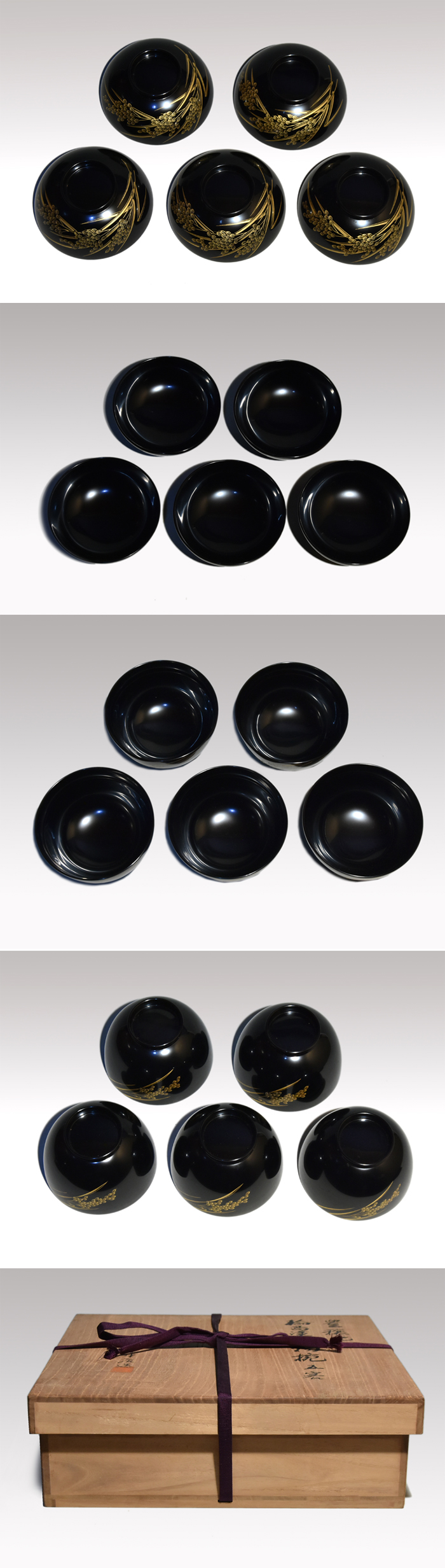 輪島屋本店(謹製)豊穣沈金輪島塗吸物椀 5客 清甫(彫) 天然木 懐石道具 茶懐石 会席 漆工芸 漆芸 木工芸 木製漆器 |