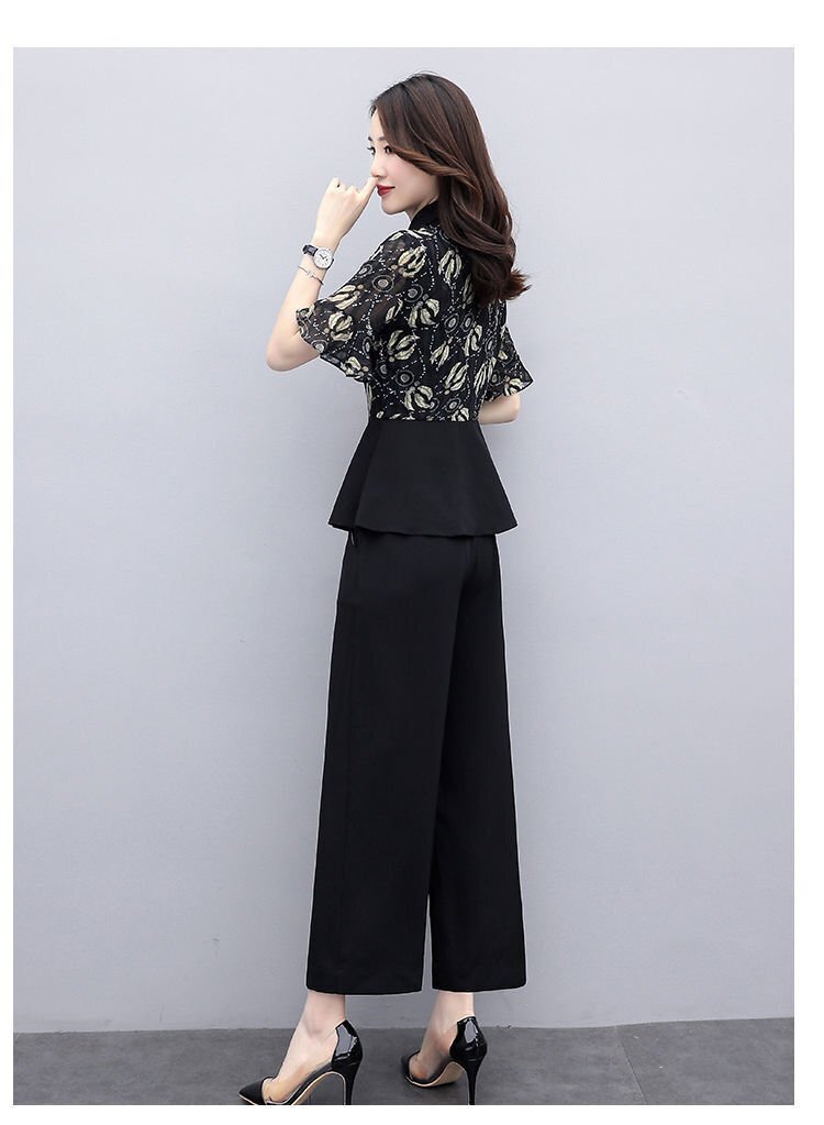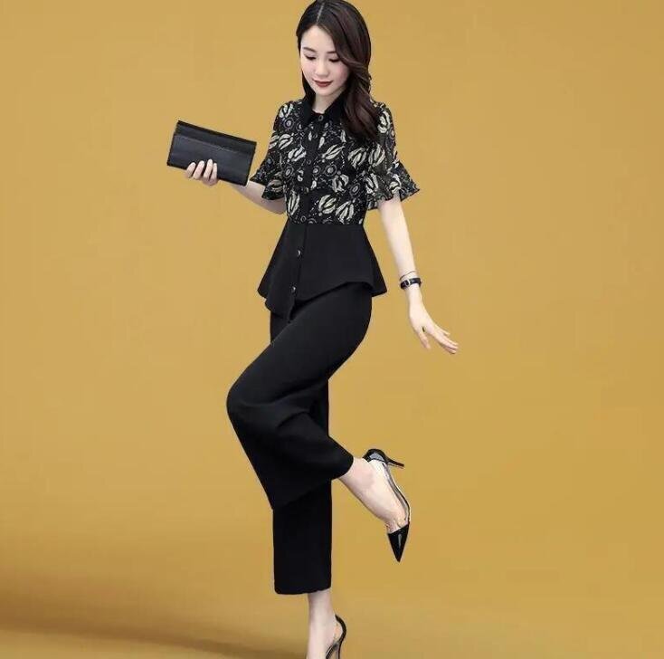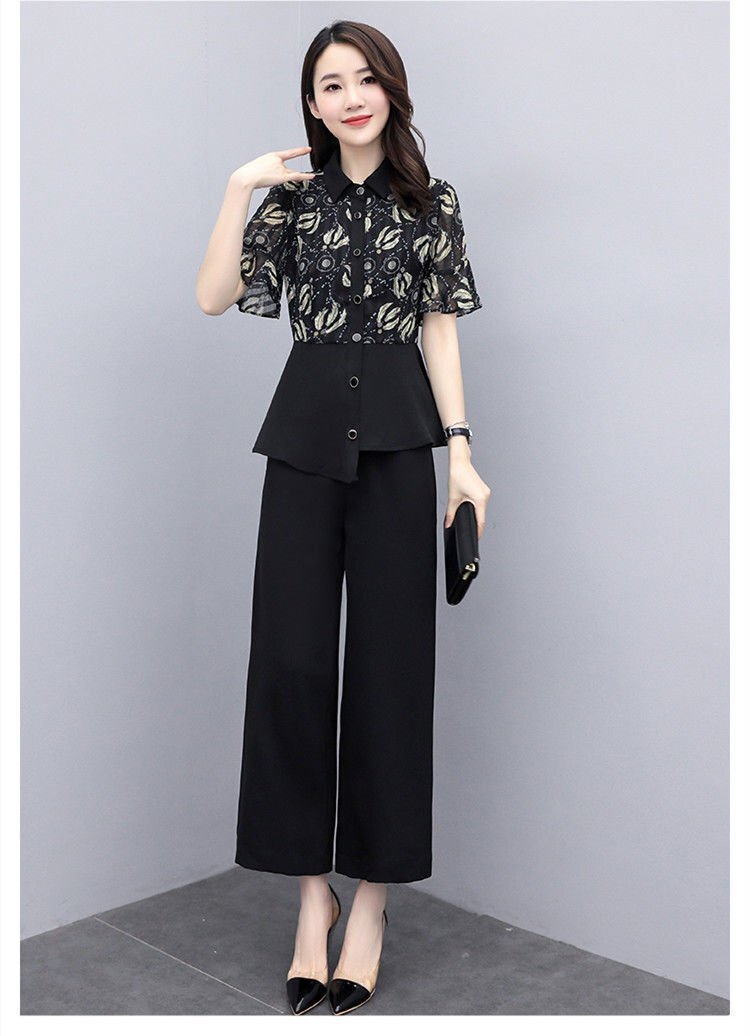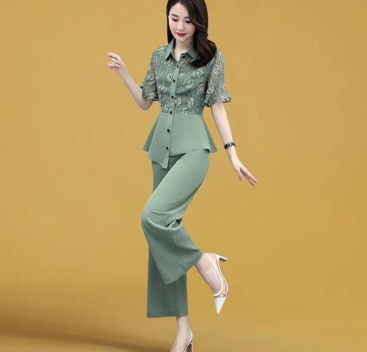 夏物 お色選択可 パンツスーツ レディース セットアップ 上下セット 春夏 2点セット 半袖シャツ ワイドパンツお洒落 花柄 通勤 入学式 Q597