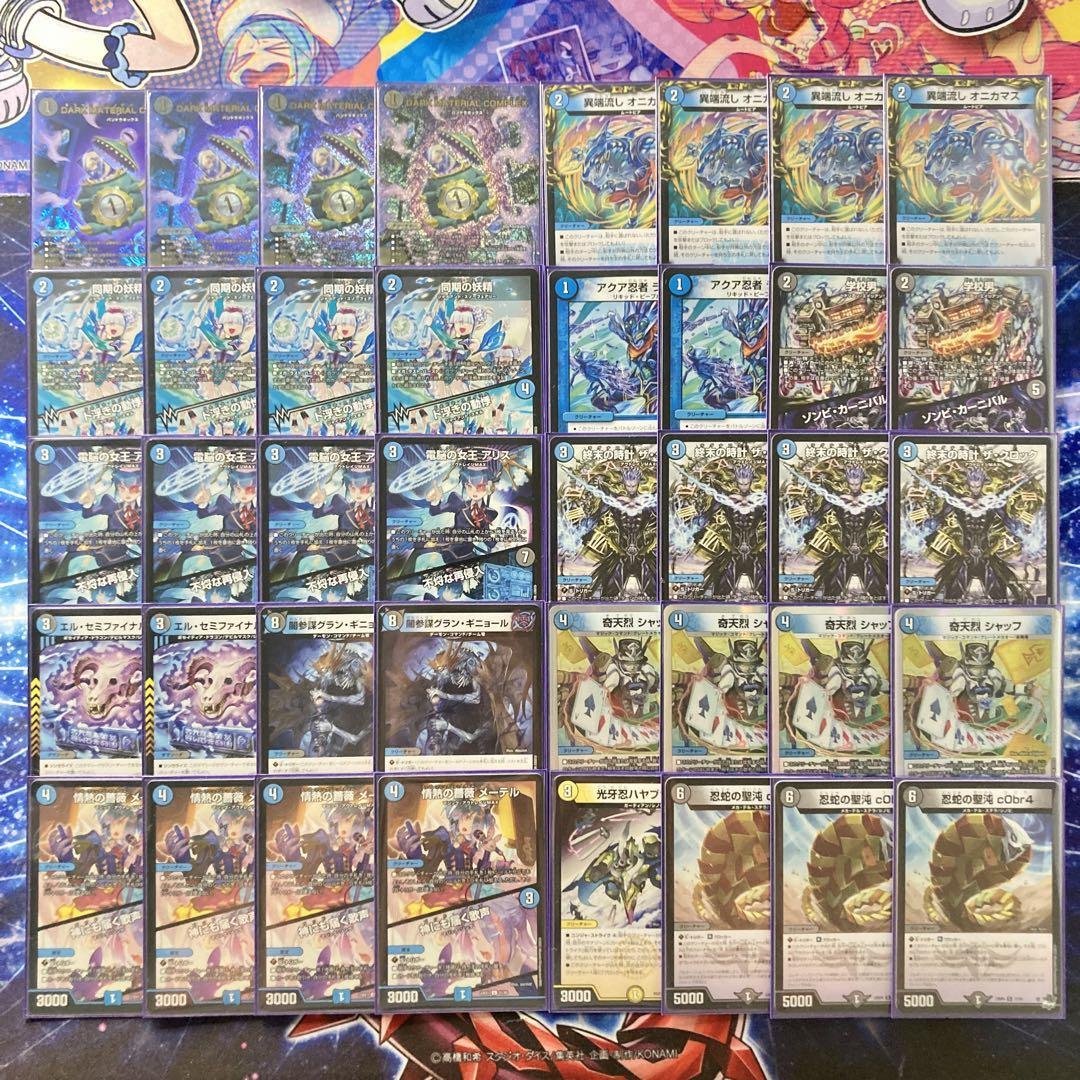 ◆環境デッキの青黒COMPLEXデッキ! ◆COMPLEXとメタクリーチャーを展開しながら能力を開放させたCOMPLEXで相手をトリガーを寄せ付けず一気に勝負を決める ◆コブラ4、同期の妖精など必須パーツや必要パーツを揃えておりまた、優勝構築をベースにした環境上位の構築 ☆インナースリーブとオーバースリーブの二重スリーブセット ↓↓↓その他デッキはこちら #かしこまデュエマデッキ #かしこまデュエマ環境デッキ ■メインデッキ 4枚 《DARK MATERIAL COMPLEX》 4枚 《異端流しオニカマス》 4枚 《同期の妖精/ド浮きの動悸》 2枚 《アクア忍者 ライヤ》 2枚 《学校男/ゾンビ・カーニバル》 4枚 《電脳の女王 アリス/不埒な再侵入》 4枚 《終末の時計 ザ・クロック》 2枚 《エル・セミファイナルのマスク》 2枚 《闇参謀グラン・ギニョール》 4枚 《奇天烈 シャッフ》 4枚 《情熱の薔薇メーテル/神にも届く歌声》 1枚 《光牙忍ハヤブサマル》 3枚 《忍蛇の聖沌 c0br4》