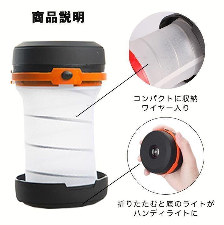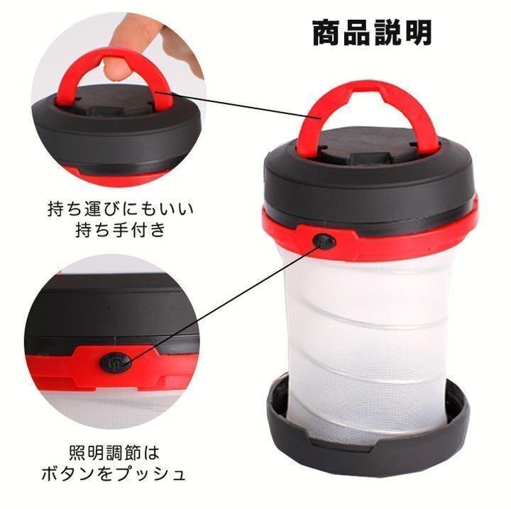●商品状態:新品未使用 ●カラー:レッド、ブルー、イエロー、オレンジ、グリーン ●サイズ: 折り畳み時:W9×H5cm/使用時:W9×H13.5cm 【重量】120g ※電池は別売りになります。 ●色の選択はお支払い前にご連絡下さい。 テント用の電池式 LEDランタン。 夜の キャンプ に必須のアイテム!雰囲気を壊さない! 軽量&コンパクトでたった120g!ポケットにも入るレベルの コンパクトな商品です。 ■ランタンと懐中電灯の2WAY ■弱光/強光/点滅の3パターン点灯 ■LEDなので低消費電力で寿命が長い ■ポップアップ式組み立て ■ご使用後はコンパクトに収納できます ■単三電池3本で稼働 ■キャンプなどのアウトドアには必需品 ■室内照明にも使えます ■様々な事態に対応するために防災対策に" |