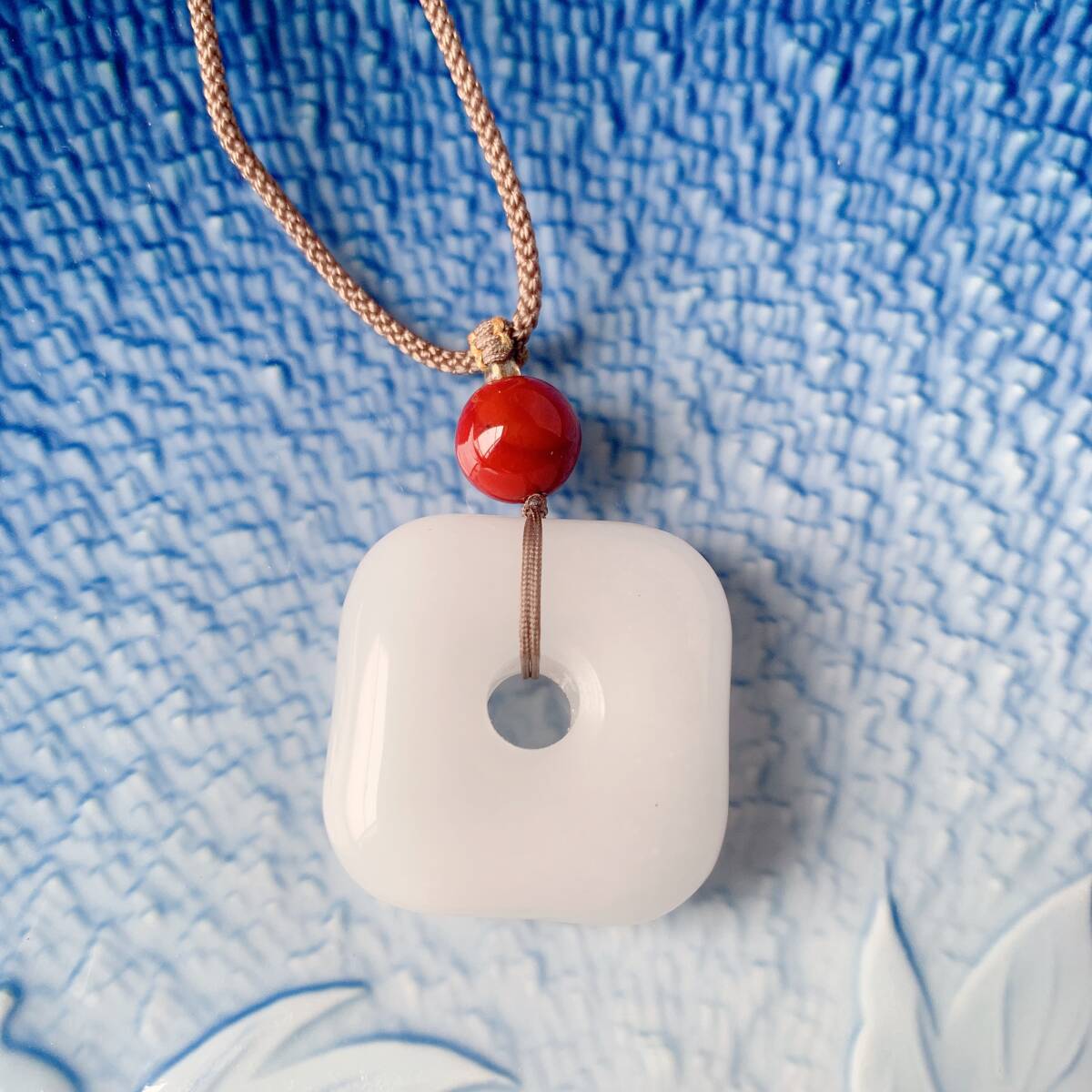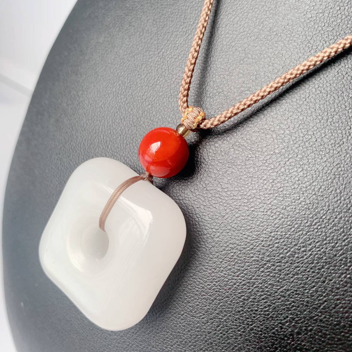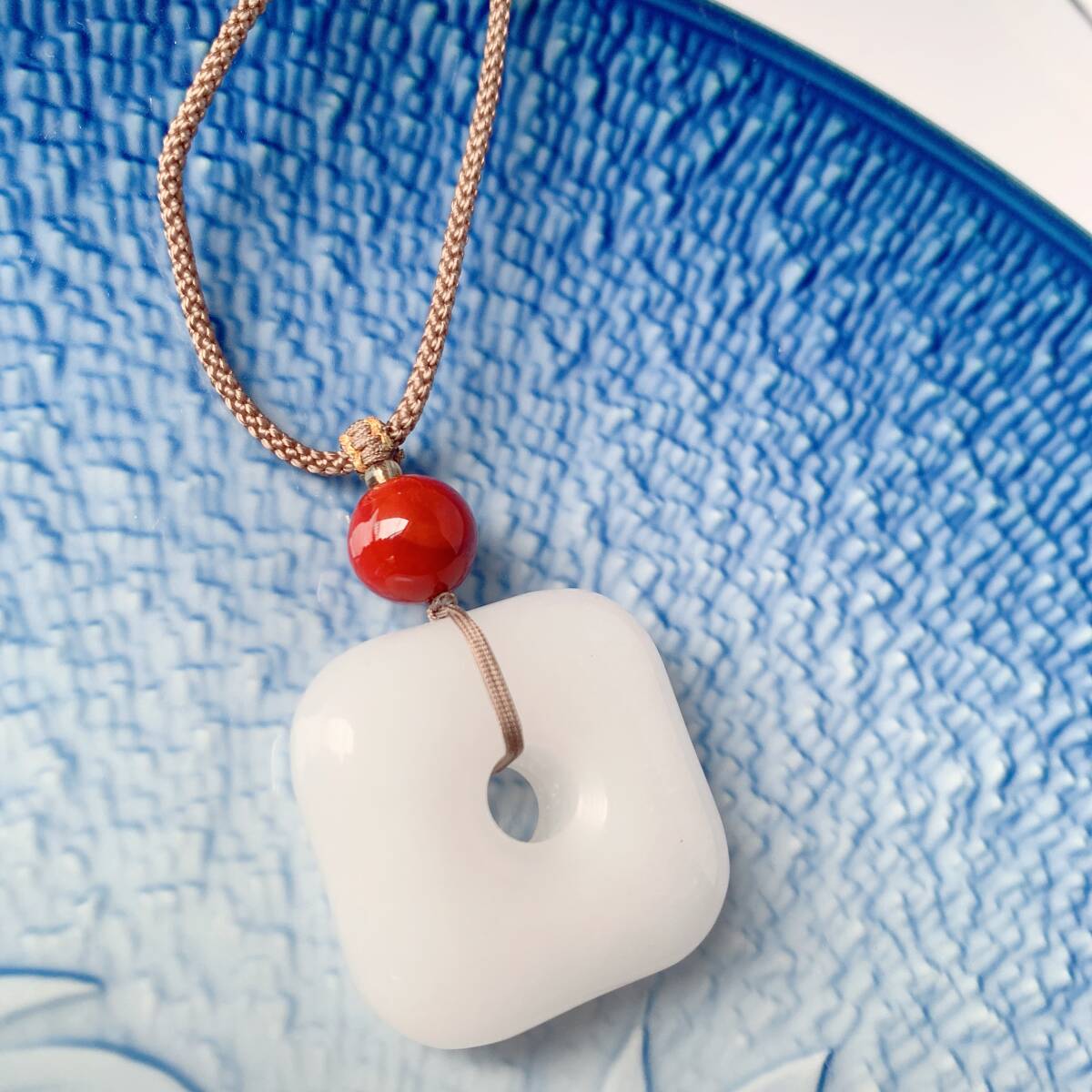 ♪金糸玉・白玉+赤瑪瑙♪ヒスイ♪ネックレス♪ペンダント♪四方平安扣♪お守り♪天然石♪パワーストーン♪巾着袋付き♪プレゼントにも
