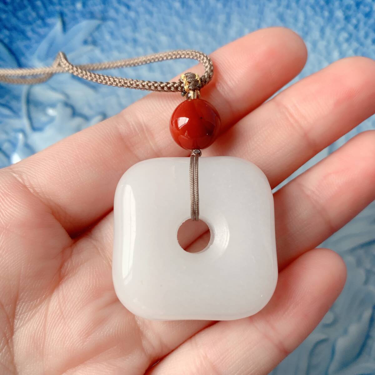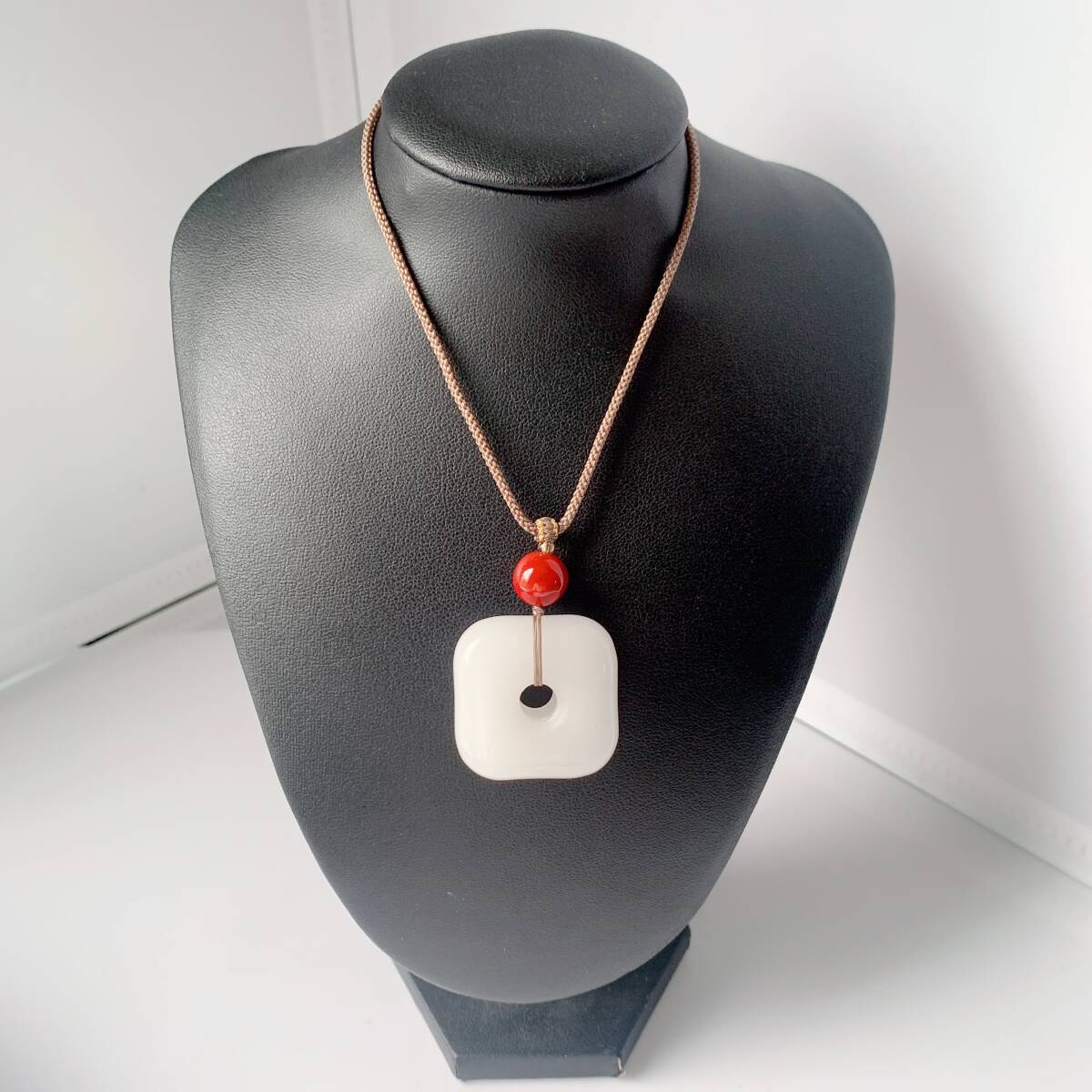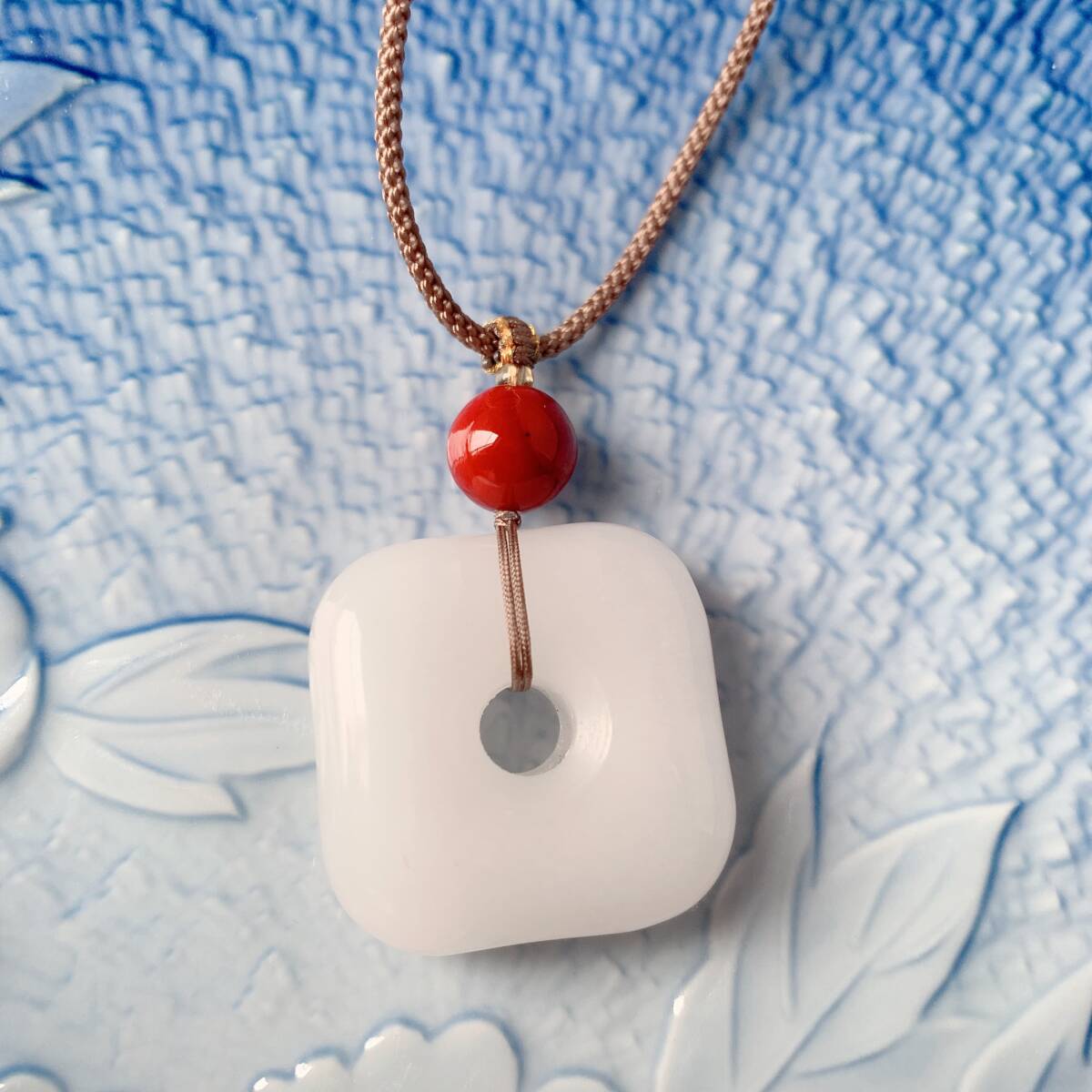 ♪金糸玉・白玉+赤瑪瑙♪ヒスイ♪ネックレス♪ペンダント♪四方平安扣♪お守り♪天然石♪パワーストーン♪巾着袋付き♪プレゼントにも