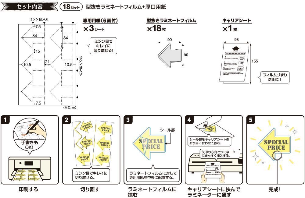 用紙とラミネートフィルムがセットになって、矢印型のPOPが作成できるキットです。
