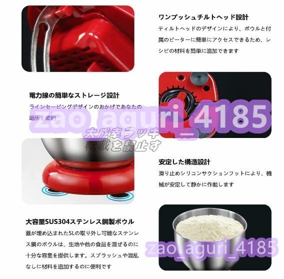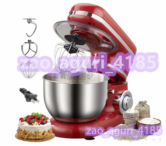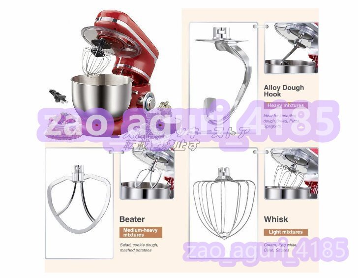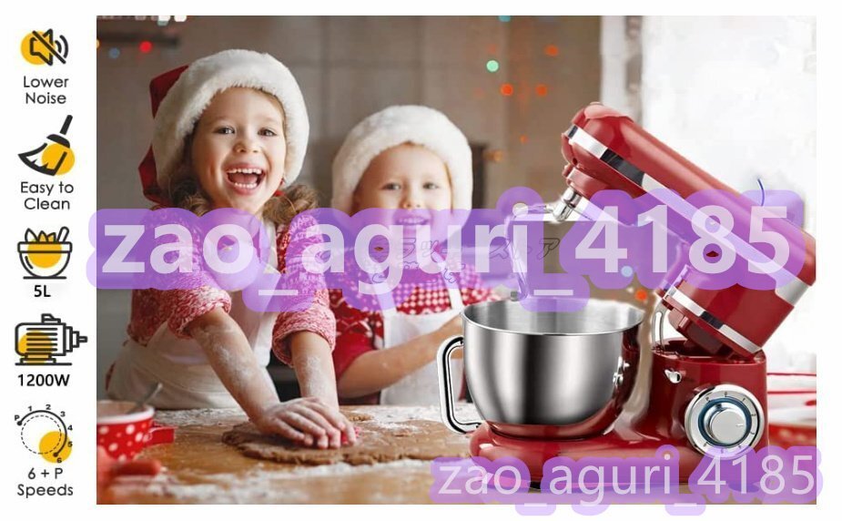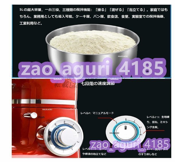 1、【業界でも驚きの多機能スタンドミキサー】洋菓子店、レストラン、家庭などでも簡単にお菓子・パン作りに大活躍の多機能スタンドミキサーです。約5リットルサイズの超大撹拌容量は1キロ程度の生地を混ぜられるのはもちろん、解除ボタンを押さないと下がらないように設計されたヘッドアップデザイン、1200W高性能純銅モーターと7階段までのスピード調節設計は自動で力強い攪拌をコントロール、両手が解放され、別の作業を同時に進行する事もできます。