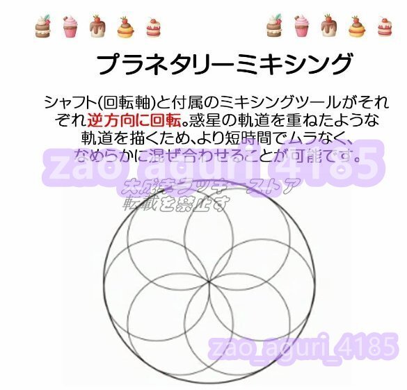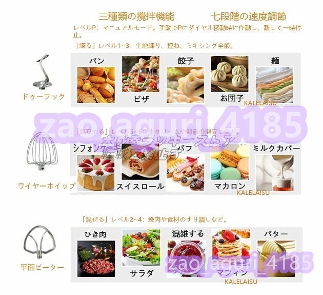 2、【5L大容量ボウル、一台三役攪拌機】この業務用ミキサーは約5リットルサイズのボウルと3種類の専用アタッチメントが付属しております。スタンドミキサー 5L大容量ボウルは最大処理能力約1kg、汚れが落ちやすいため、ボディの清掃が簡単です。用途に合わせて使える3種類の専用アタッチメントは、泡立てる、混ぜる、こねるといった難しい工程を自動で行って調理が楽しくなります。独自のボウル形状と撹拌軸の動きで、混ぜムラ、混ぜ残しがありません。例え、「ホイッパー」の独特なフォルムと国際規準の12枚ステンレスワイヤーが最大限に空気を含ませて泡立ちます。また、プラネタリーミキシングにより手作業のように理想的な泡立て、混ぜ、こねが可能です。