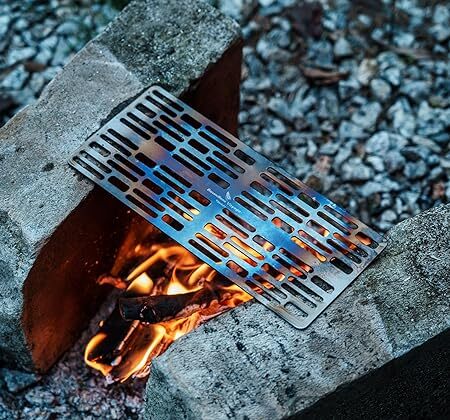 焚き火上やバーナー上で、肉だけでなくパン・野菜・ウィンナーなどの食材も調理できる鉄板。