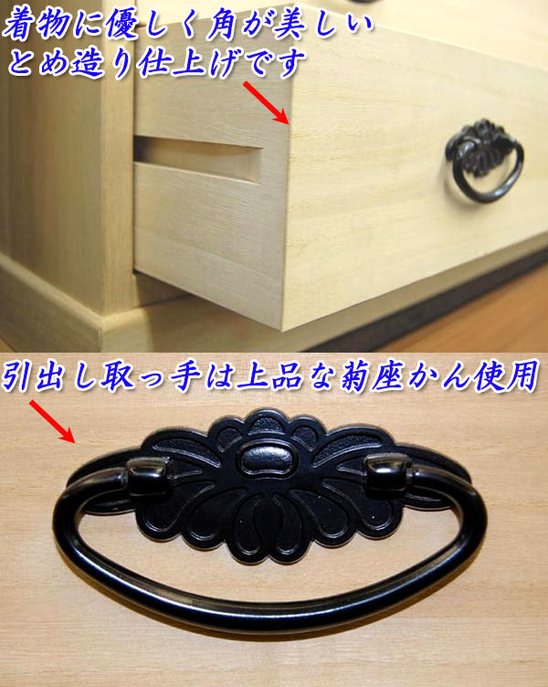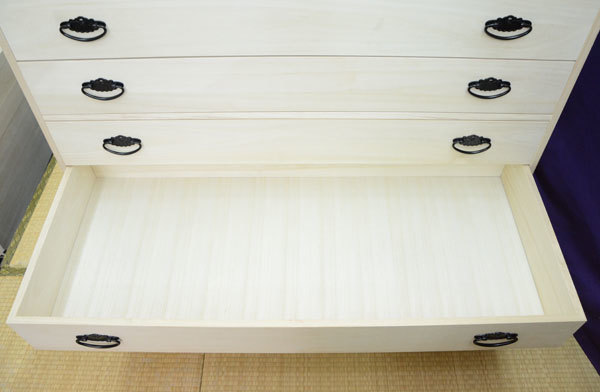 天板・側板の厚みも15mmを使用しており背板、 底板には4MMの桐芯材に桐突き板で 総桐仕様に仕上げております。 京都市やま限定のオリジナル商品になります。 桐材に厳しい社内基準を満たした良質で 本物の桐を使用しておりますので、 きれいな節のない木目と色も安定しております。 接着剤にもこだわりをもっており、フォースター(四つ星)の安全基準を 誇っている接着剤を使用しております! 箱の中にもこだわりで面取りといって、木の表面や角を削ることによって箱を 開けた時の美しさが違います! キャスターが付いておりますので 押入れから出される時も非常に便利です!!1段につき着物が3-4枚入ります (着物の厚みによって変わります) 帯や小物の収納に大変便利です。 |