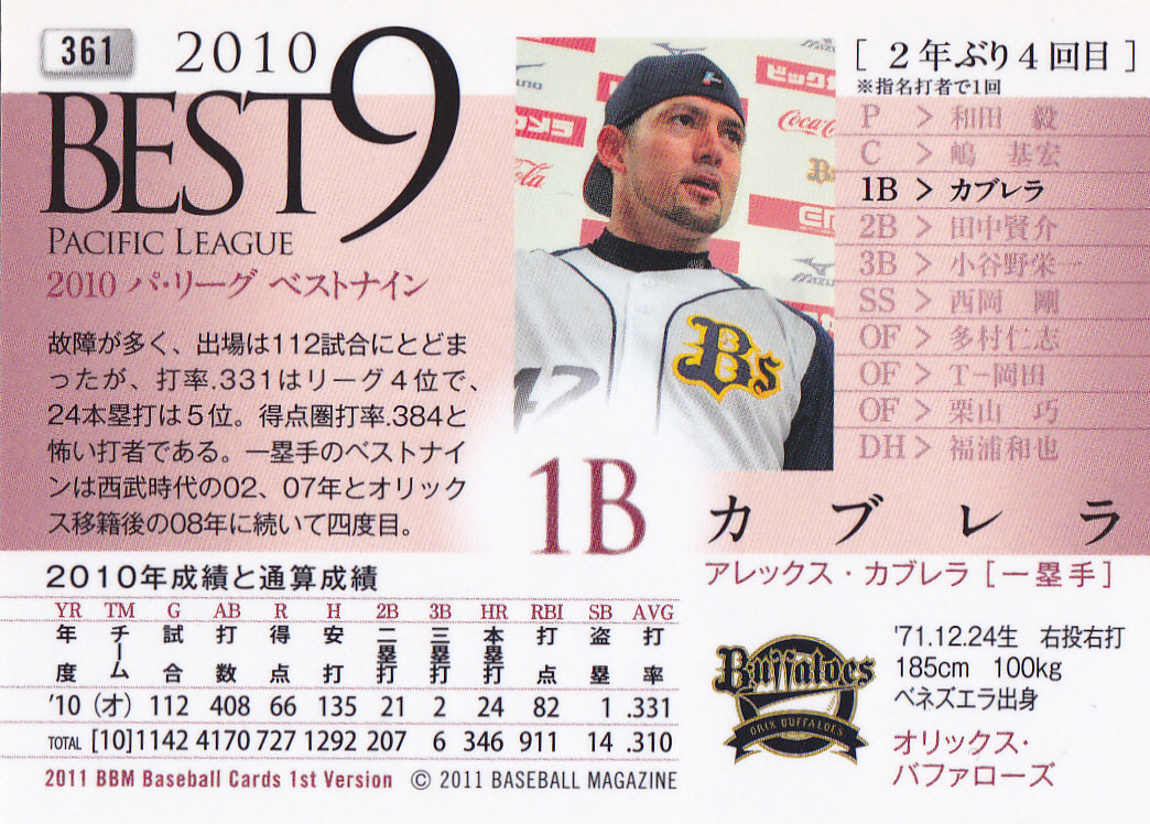 2011BBMベースボールカード1st 361 アレックス.カブレラ オリックス ベネズエラ ベストナイン