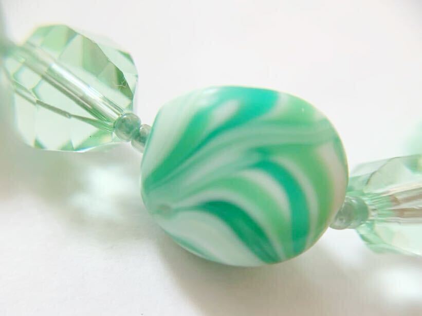 ひとつひとつ手作りされたガラスビーズが使われており、透明度の高いグリーンと乳白色のコントラストはとても爽やかです。明るい黄緑色からエメラルドグリーンへの変化が見られるマーブル模様の中にカラーの濃淡が見事に生み出され、さりげなく個性的で、他のアクセサリーにはない魅力が詰まったネックレスです。