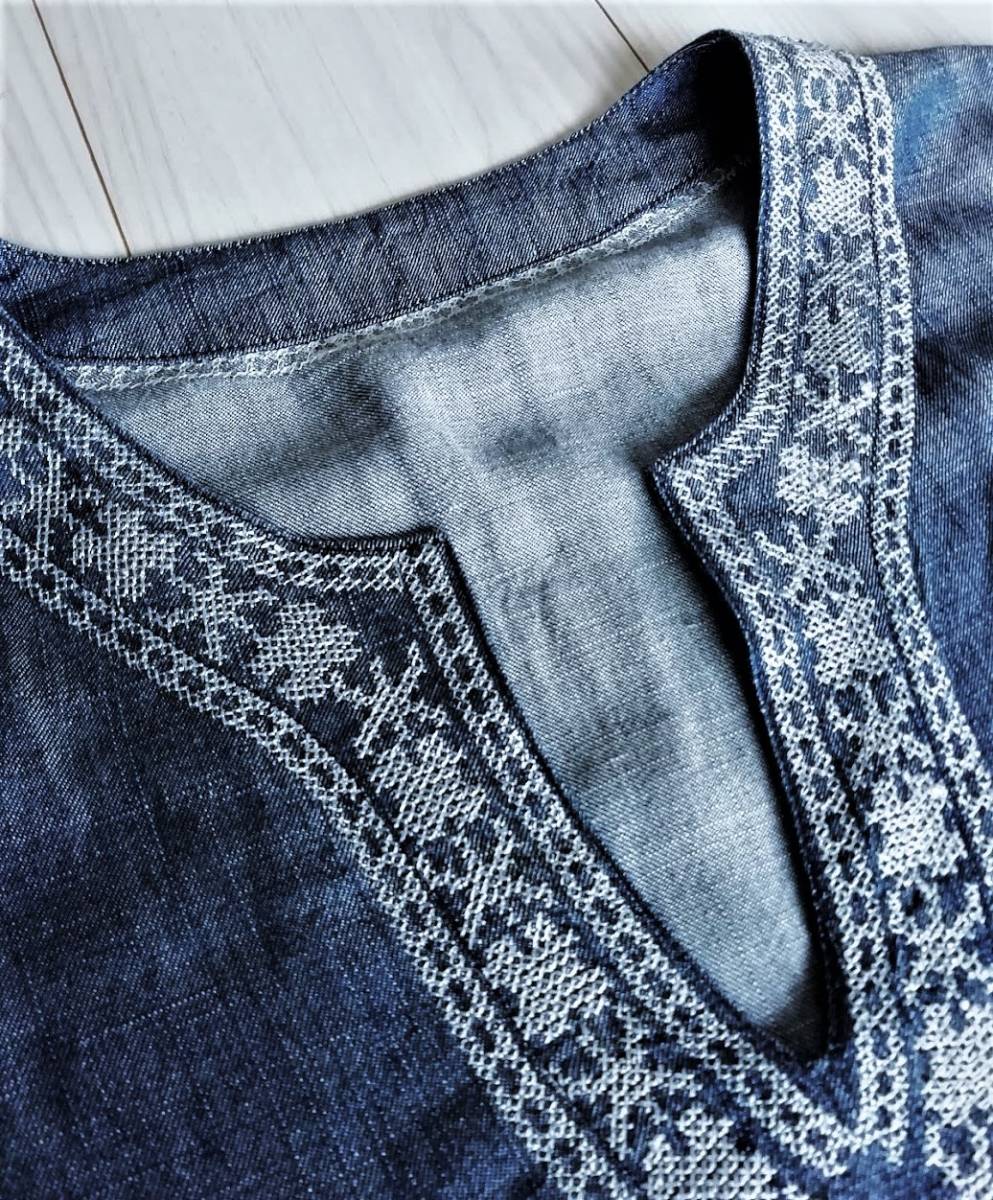デニム風の柔らかな麻混素材に刺繍が施された、