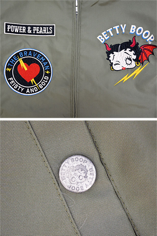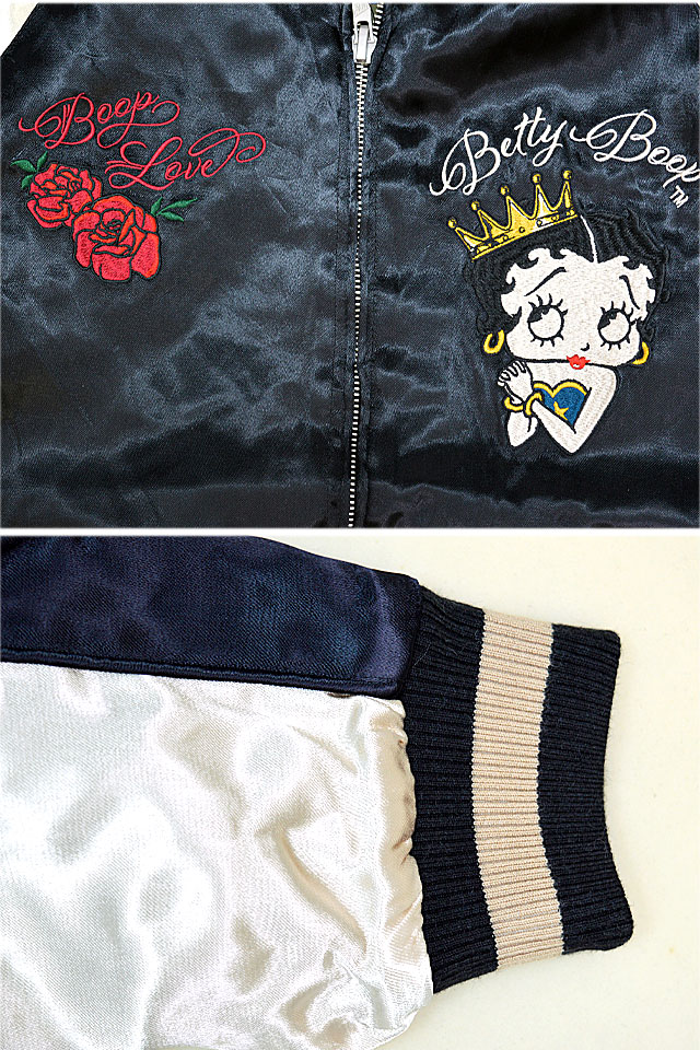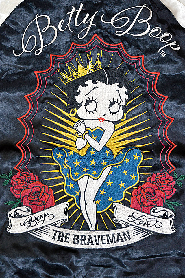 1920年代~40年代にアメリカでワークウェアを中心とした製品を世に送り出したブランド「The BRAVE-MAN」から「BR×BETTYコラボ サテン×ナイロンツイルリバーシブルスカジャン(BBB-2453)」のご紹介です。 大きな瞳とぽってりした赤い唇が印象的な女の子、ベティ・ブープ(Betty Boop)。 今回は表裏に全く異なる柄を落とし込んだ、豪華なリバーシブルスカジャンです! 表面にスカジャン、裏面にMA-1ジャケットを採用。 着こなしに合わせて、表裏使い分けて頂けるアイテムです。 裏面は身頃のポケットにスナップボタンを縫い付け、左袖にミリタリーポケットを配置しました。 1枚持っているだけでずっと使えるスカジャン。 | ||||||||||||||||||||