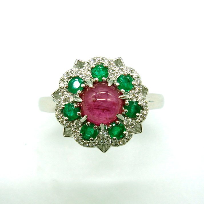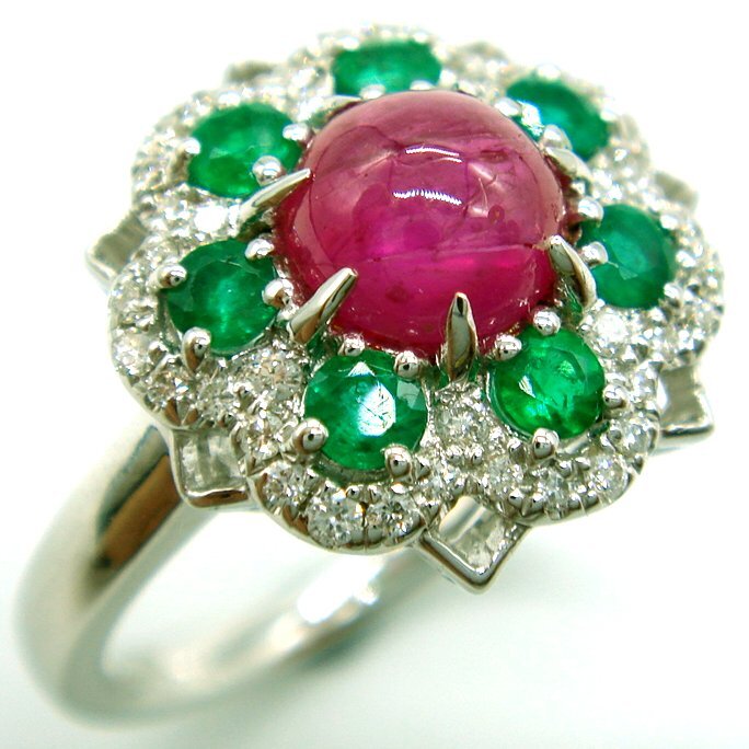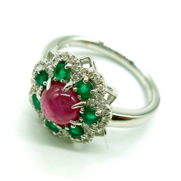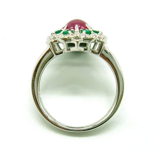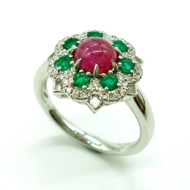 カボッションカットの大粒ルビー自体と、ルビーの赤とエメラルドの緑のコントラストが美しい、なんともジュエリーらしい高級感あるリングです。