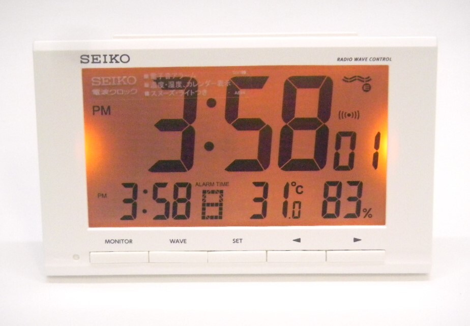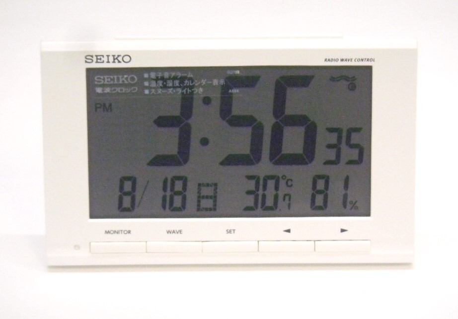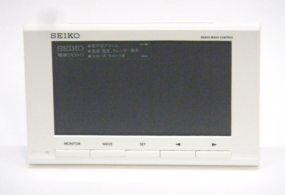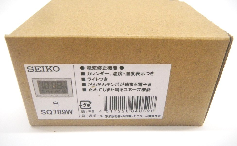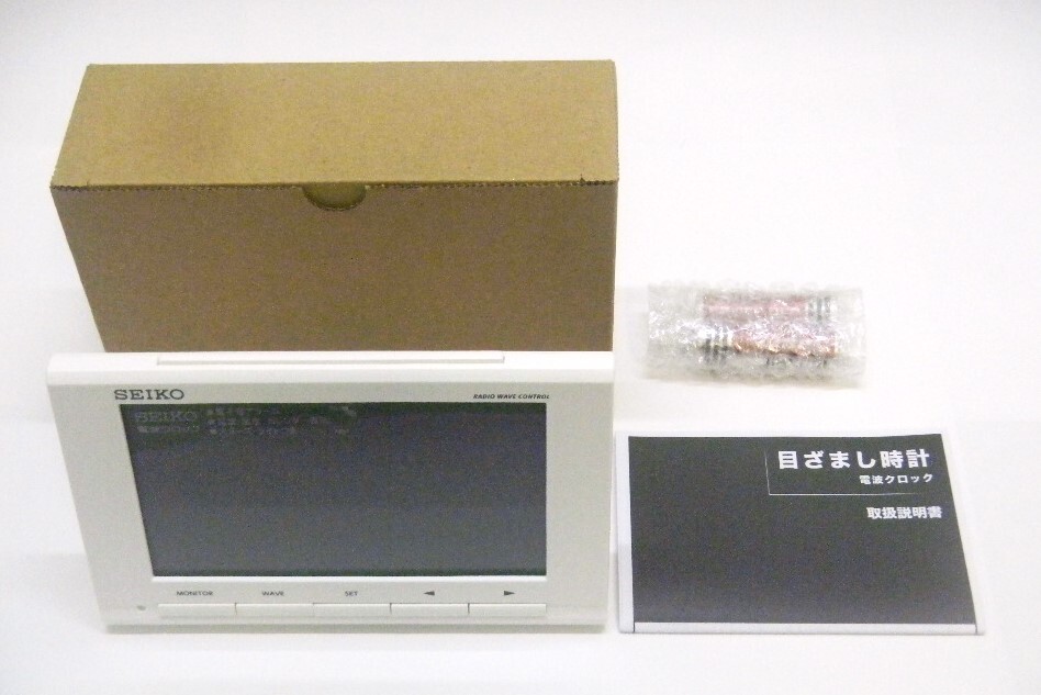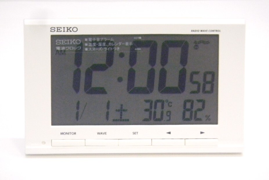 セイコー 目ざまし時計 電波クロック SQ789W 注1説明書をよく読んでから、ご使用してください。 注2おまとめ取引の場合は、ゆうパックのみの発送になります。 なお、送料も異なります。 【モデル】SQ789W 【希望小売価格】オープン価格 【製造】Made in China 【製造年】不明 【カラー】ホワイト系 【特長】 ●電波修正機能 ※電波を受信できない場合でも、クオーツ時計としてお使いいただけます。 ●カレンダー、温度、湿度表示つき ●ライトつき ●だんだんテンポが速まる電子音 ●止めてもまた鳴るスヌーズ機能 【仕様】 ■時間制度:平均月差±30秒(気温5℃から35℃で使用した場合) (電波受信による時刻修正を行わない場合) ■表示精度:±1秒(電波受信による時刻修正を行った直後) ■使用温度範囲:-10℃~+50℃ ただし、表示判読可能温度範囲 0℃~+40℃ ■アラーム:電子音、約5分間オートストップ、 約5分間スヌーズ(スヌーズは何回でも繰り返すことができます。) ■カレンダー:2000年1月1日~2099年12月31日のフルオートカレンダー 月末、うるう年とも修正不要。 ■温度測定範囲:0℃~+40℃(測定範囲内での精度±2℃) ■湿度測定範囲:25%RH~85%RH(測定範囲内での精度25℃で±8%) ■表示内容:日付(月/日、曜日)、 午前/午後表示による12時間制または24時間制表示 周囲温度(℃)・湿度(%) ■使用電池:単3形乾電池×2個 ■電波受信機能 ・自動受信 (午前2時から3時間ごと。次回の受信までクオーツの精度で動いています。) ・手動受信:ボタン操作による 2つの電波(40KHz/60KHz)のうち最適な方を選択し受信します。 【サイズ】幅約148mm×奥行約40mm×高さ約90mm 【質量】約165.5g 【付属品】画像に写っている物のみです。 【状態】新品での保管品でしたので、念の為開封し、電波受信、アラームの動作確認しました。 箱は少々痛みがあります。 【コメント】 画像と実物の色やサイズは、やや異なる場合があります。 知識がありませんので専門的な質問の場合は、詳しくどこを確認するかをおしえていただければ、 何とか回答いたします。よろしくお願いいたします。 説明不足があると思いますが、詳細をよく読んで、 ご理解、ご了承していただいた上での、ご入札をお願いいたします。 【ゆうパック料金表】