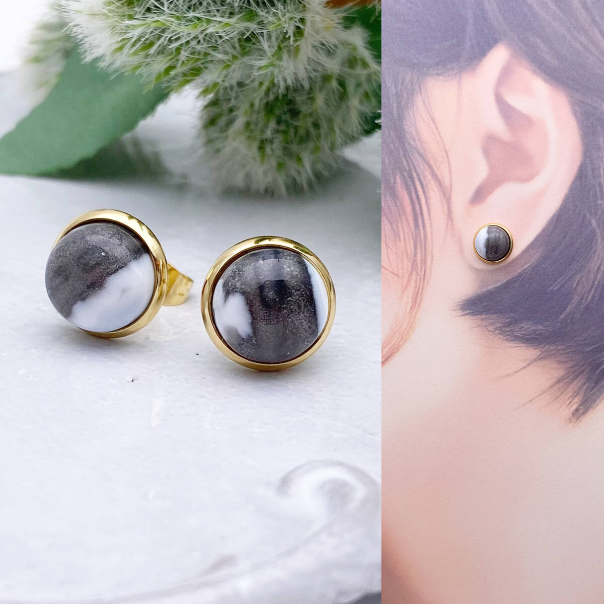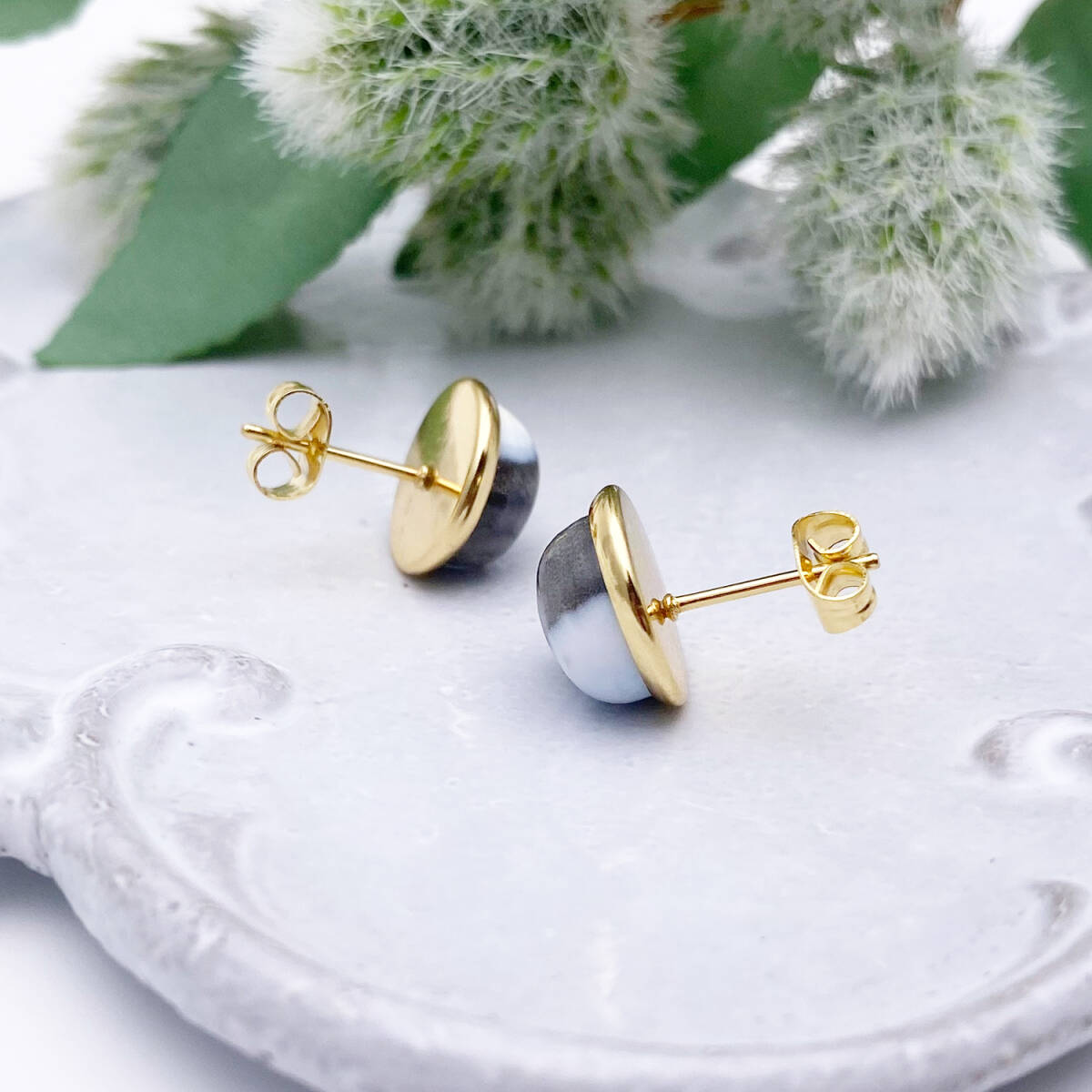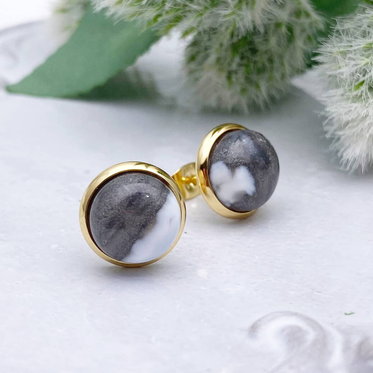 【黒色多め】デザートオパール・カボション10mmスタッドピアス/24kgp