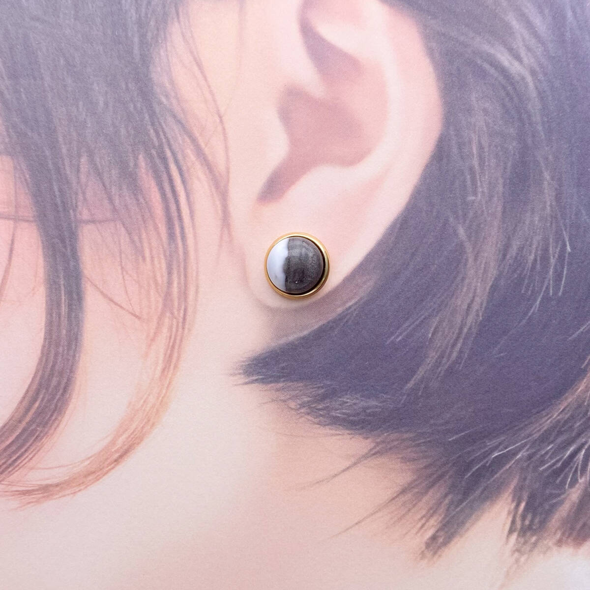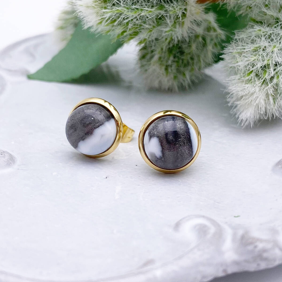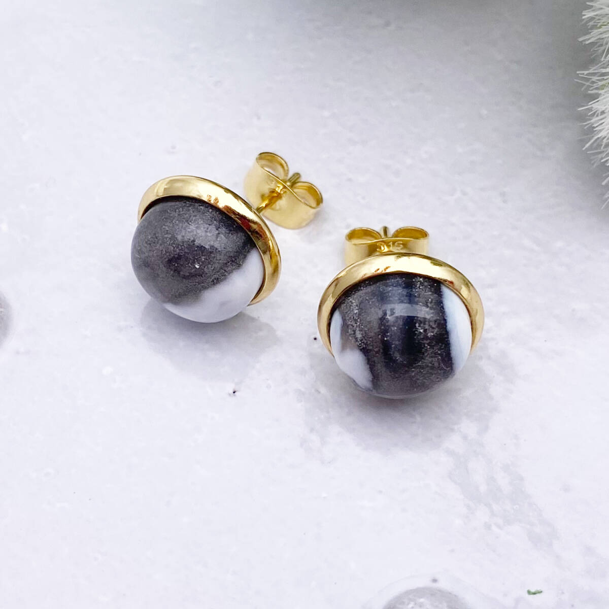【黒色多め】デザートオパール・カボション10mmスタッドピアス/24kgp