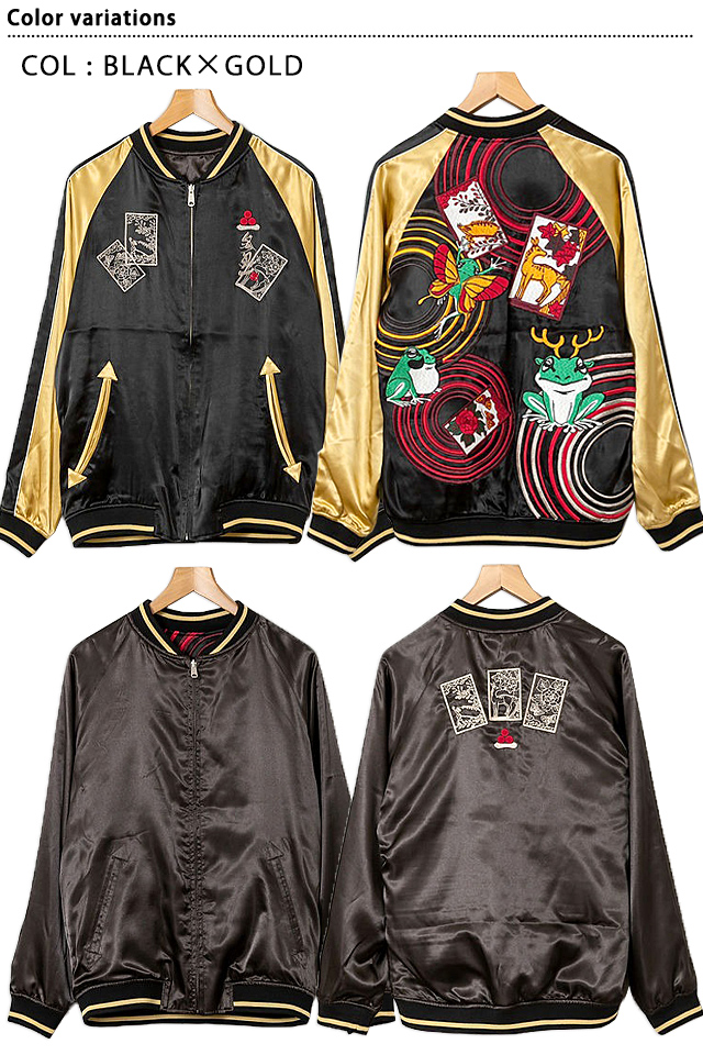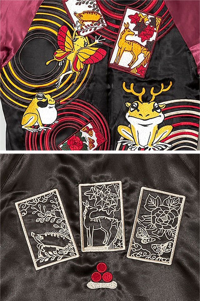 「参丸一」さんから「花札猪鹿蝶」総刺繍リバーシブルスカジャン(SM-30612)のご紹介です。 花札で遊んでいたら突然近くの蛙たちの様子が!? また、今回のスカジャンはリバーシブルになっています。 ボディーにはレーヨンサテンを採用。 1枚持っているだけでずっと使えるアイテムです。 | ||||||||||||||||||||