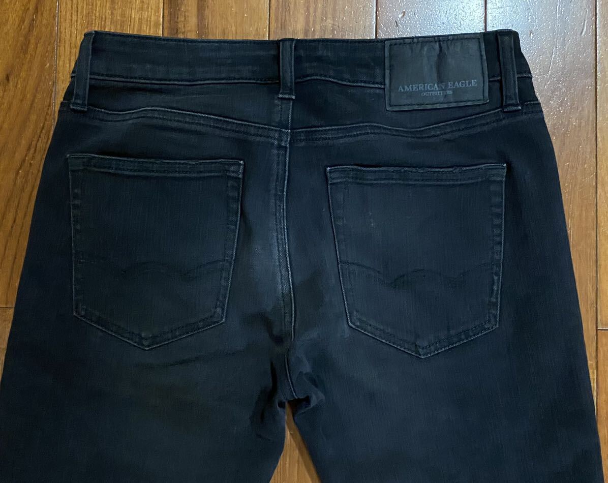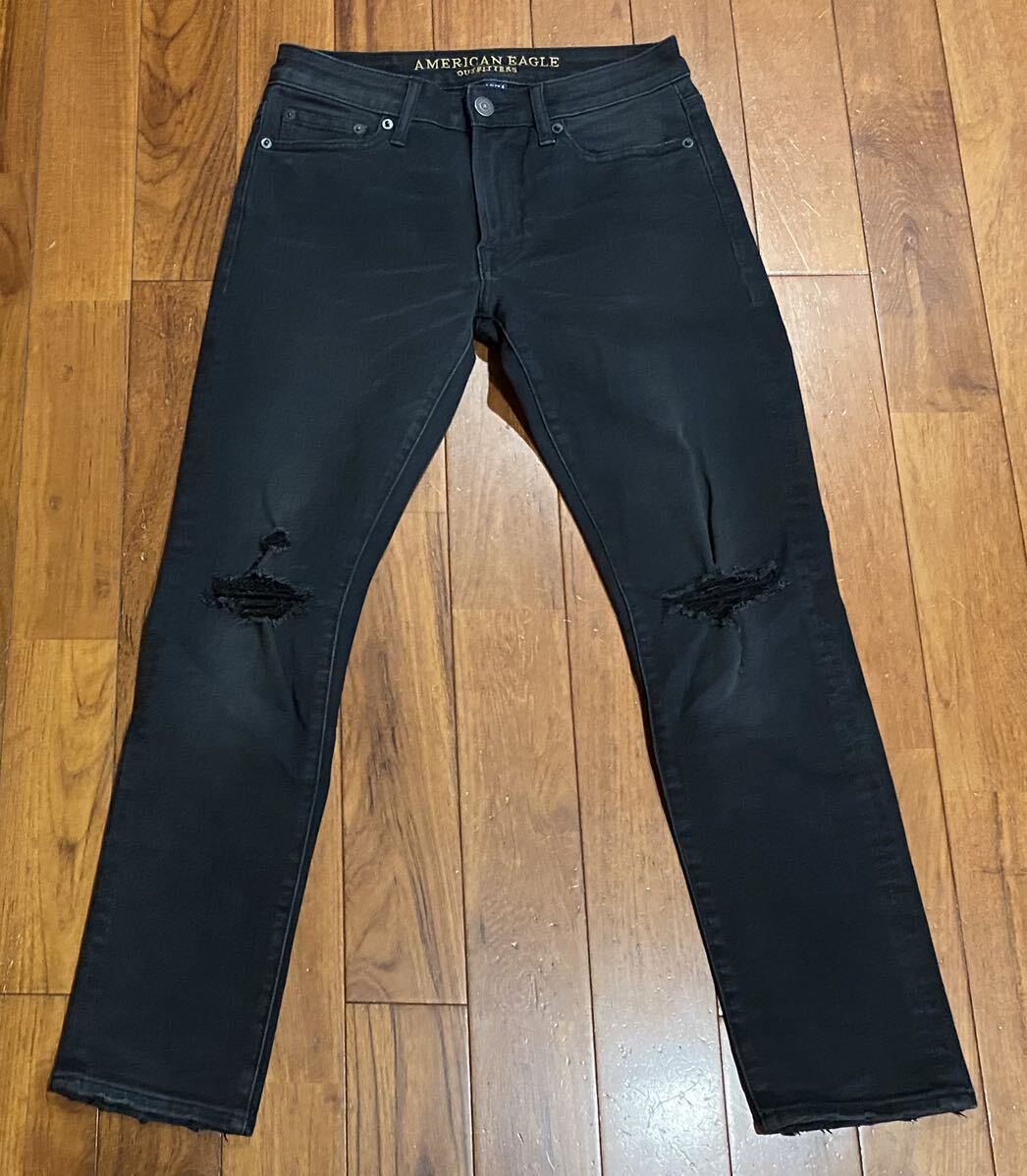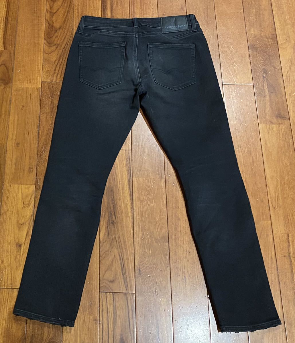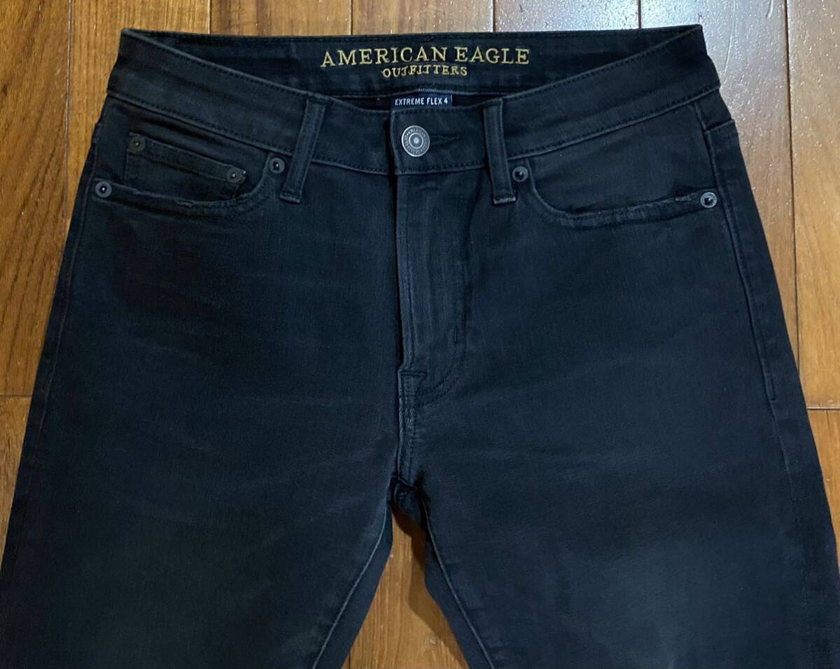 アメリカンイーグルのストレッチデニム(ジーンズ)、EXTREME FLEX 4 SLIMです。色は薄ブラックです。USEDですが状態は良いです(10段階中8程度)。生地はストレッチ入りでコットン83%、ポリエステル13%、ポリウレタン4%です。紙パッチ、ジッパーフライ、裾はチェーンステッチです。正規品です((株)イーグルリテイリング、中国製)。サイズはW28×L28でウエストは重ねずに平置きで約72cm、ヒップ約93cm、股上約23cm、股下約69cm、股下15cmのふともも部分約46cm、裾まわり約32cm、重量約510gです。発送はゆうパケットポストになります。