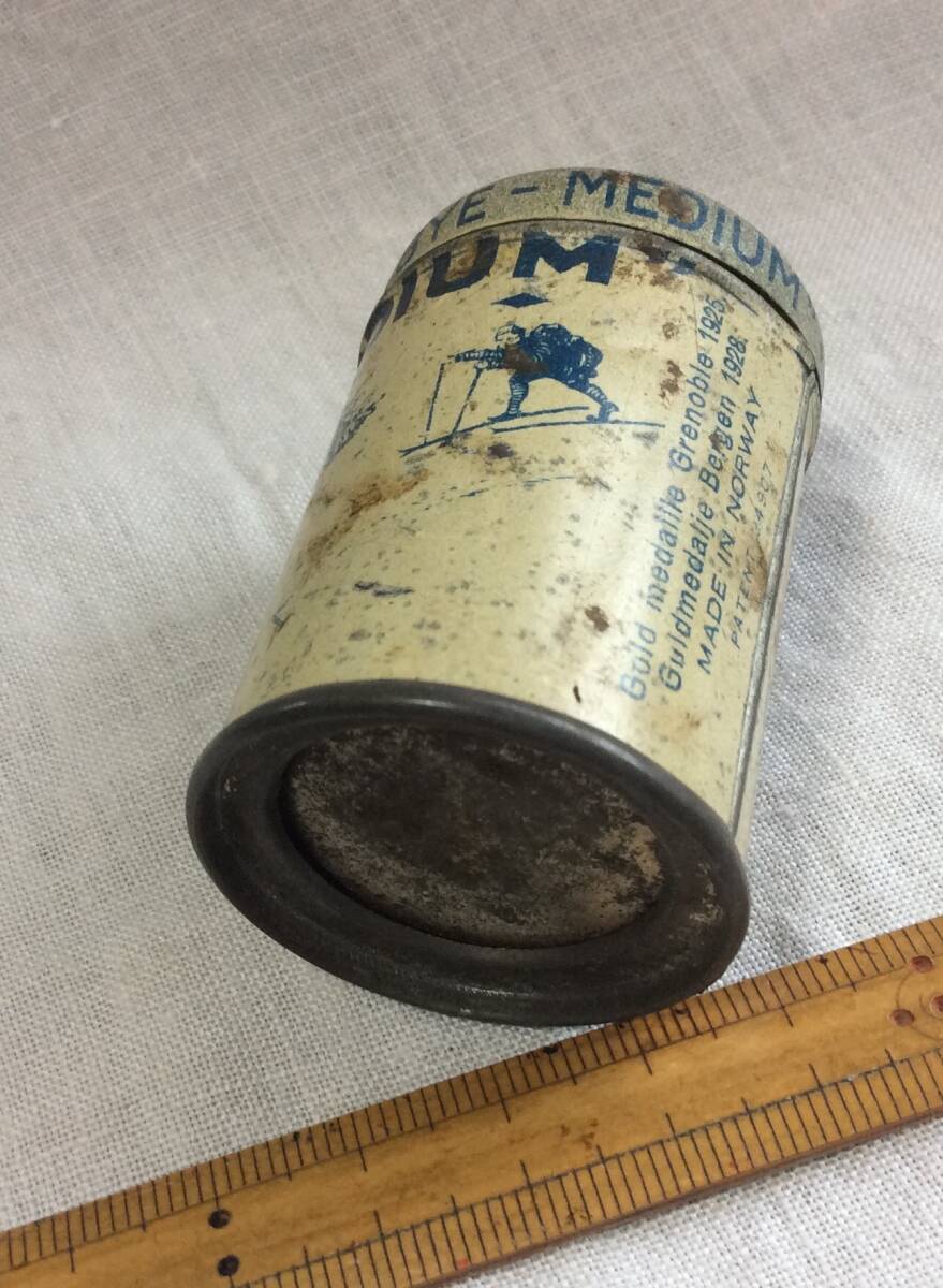 古い缶 OSTBYE-MEDIUM NORSK SKISMRINGノルウェー スキー ワックス 缶 スキー グラフィックス 1930-50 中身あり