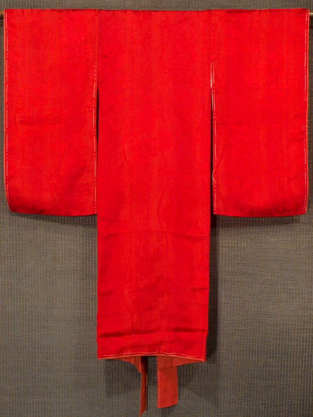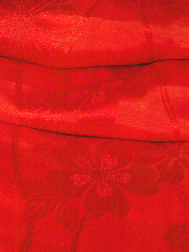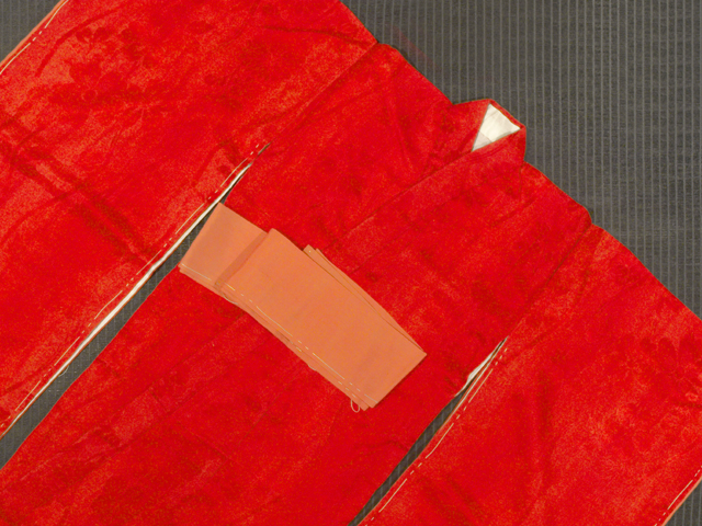 猩猩緋(しょうじょうひ)色の地に、菊と桜の地紋が織り出されている、紋羽二重の一つ身の女の子用の長襦袢です。袷仕立てです。 アンティークに近いお品です。なめらかでふんわりとしたやわらかな手ざわりの羽二重地です。 しつけ付きの仕立て上がり未使用保管品ですが、右衿など、全体のところどころに直径約 1-2mm のよごれがちらほらと数か所程度あります。そのほかに目につく大きなしみやよごれ、褪色などのダメージなく、全体的にはとてもきれいな状態です。 |