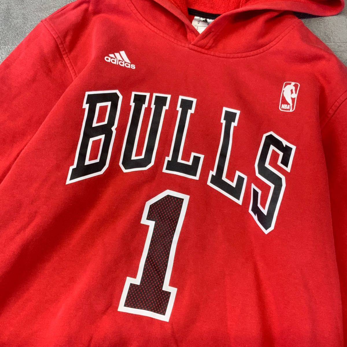 美品 adidas アディダス NBA BULLS #1 ROSE 両面プリント スウェットパーカー メンズ Oサイズ レッド
