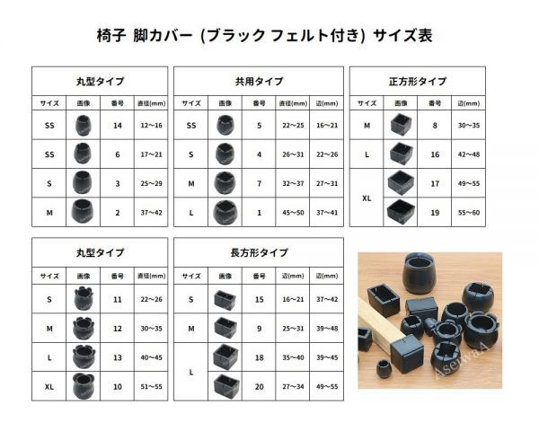 ・20種類のサイズバリエーションで、さまざまな家具の脚に対応します。