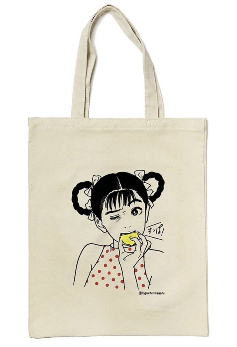 江口寿史デザインのトートバッグです。こちらのイラストは、漫画アクション(双葉社)の表紙のために描かれたものです。新品未使用品で未開封ですが、一度人の手に渡ったことをご理解の上、ご購入お願いいたします。