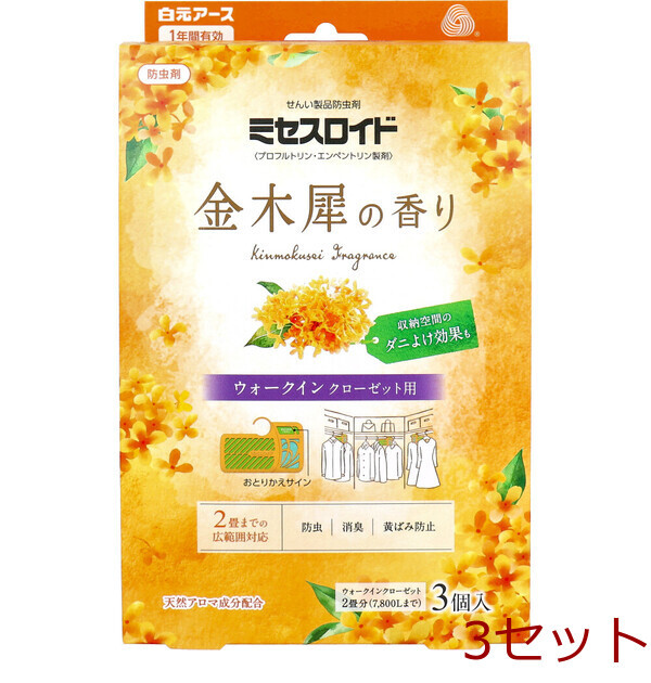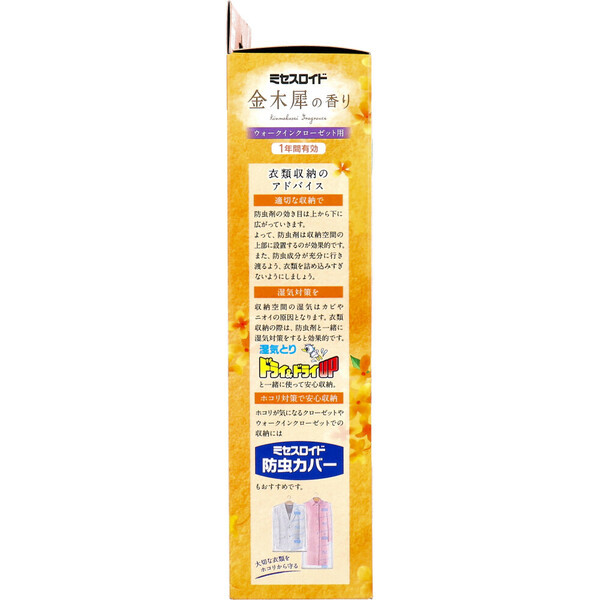 2畳までの広範囲対応。 収納空間のダニよけ効果も。 天然アロマ成分配合。 ・ニオイがつかない防虫成分が大切な衣類をせんいの虫から守ります。 ・消臭成分配合。 収納空間の気になるニオイを消臭します。 (※気になるニオイ:カビ臭・汗臭・体臭) ・黄ばみ防止成分配合。 衣類保管時の黄ばみを防ぎます。 (※窒素酸化物(NOx)による黄ばみ) ※汚れが原因の黄ばみには効果がありません。 ※黄ばみを消す効果はありません。 ※素材、生地によって効果は異なります。 ・せんいの防虫に加え、気になるダニを収納空間内に寄せつけにくくします。 (ピレスロイドの効果) ※収納空間内に屋内塵性ダニを寄せつけにくくする効果を確認しています。 マダニやイエダニを対象とした製品ではありません。 ・取り替え時期がひと目で分かる「おとりかえサイン」付きです。 ・金糸、銀糸、ラメ加工製品、ボタン類(金属、プラスチック製品)などにも安心して使えます。 ・和服、毛皮等の皮革製衣類にも使えます。 ・ミセスロイドは、他の防虫剤と一緒に使えます。 ・金木犀の香り。 道端でふわっと香る、甘くて心地よい金木犀の香りが衣類をやさしく包みます。 ・ウォークインクローゼット2畳分(7800Lまで)。 個装サイズ:140X225X53mm 個装重量:約160g 内容量:3個入 製造国:日本 【発売元:白元アース株式会社】 【成分】 プロフルトリン、エンペントリン(ピレスロイド系)、鉱物系吸着剤(消臭成分・黄ばみ防止成分)、香料 【適用害虫】 せんいの防虫効果:イガ、コイガ、ヒメカツオブシムシ、ヒメマルカツオブシムシ 収納空間のダニよけ効果:屋内塵性ダニ 【有効期間】 使用開始後、約1年間(防虫効果) ※温度、収納空間、使用状態などで有効期間は一定しません。 ※「おとりかえサイン」のでかたは季節や収納状態によって異なる場合があります。 【標準使用量】 幅180cm×高さ240cm×奥行180cm(=7800L)のウォークインクローゼットに3個。 【使用方法】 ・袋から取り出し、ウォークインクローゼット(容量7800Lの場合)のパイプに3個吊り下げてください。 (収納空間で等間隔に吊るすと効果的です。) ・「おとりかえください」の白い文字が出たら、香りが残っていてもお取り替えください。 ★収納の前に ・衣類の汚れをきちんと落としてください。 ・衣類をよく乾燥させてください。 ・クリーニングのカバー等は外してください。 【保存方法】 密封して温度の低い直射日光の当たらない所に保存してください。 【使用上の注意】 ・パッケージに記載されている使用量を守ってご使用ください。 ・衣類の入れ替えをする時は、部屋の換気を行ってください。 ・幼児の手のとどく所に置かないでください。 ・ウォークインクローゼット等の扉は閉めて、密閉性のある直射日光の当たらない収納空間でご使用ください。 ・本品は食べられません。 万一食べた時には医師にご相談ください。 ・誤食等の対応のため、商品の使用中は箱を保管してください。 ・用途以外には使用しないでください。 ・本品はプラスチックゴミです。 使用後は地方自治体の区分に従って捨ててください。 注意事項 ※予告なく成分・パッケージが変更になることがございます。 予めご了承ください。 *予告なく成分・パッケージが変更になることがございます。予めご了承ください *ダンボールを使用して発送する場合には、入数以下の個数の場合、 中古ダンボールを使用する場合があり、ご注文の商品とは異なるダンボールになる場合があります。 あらかじめ、ご了承ください。 |