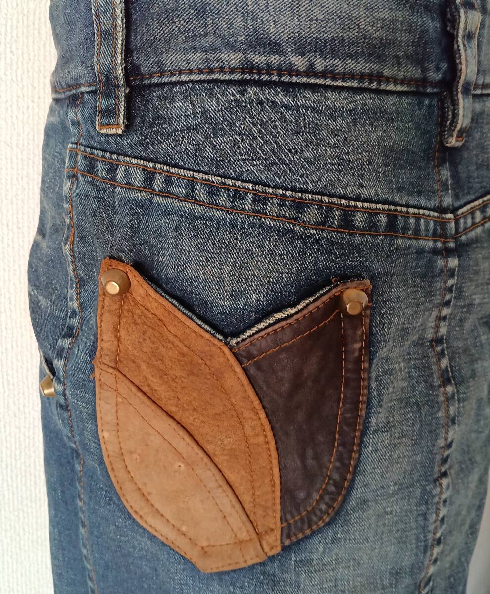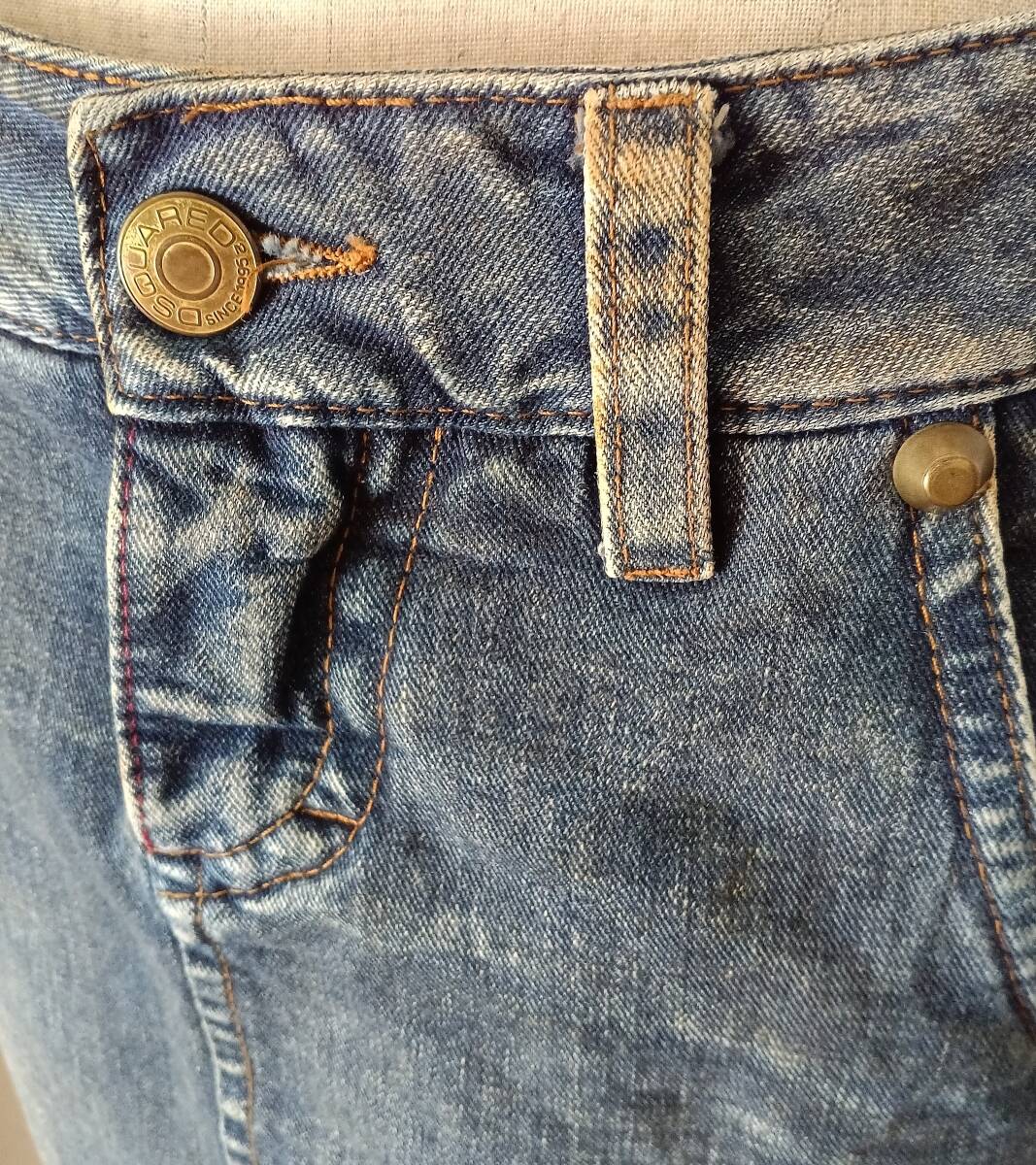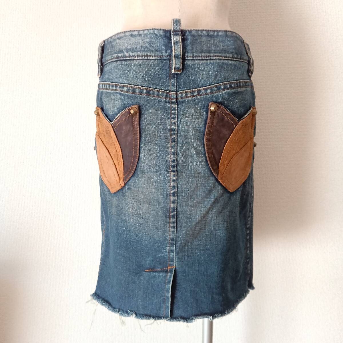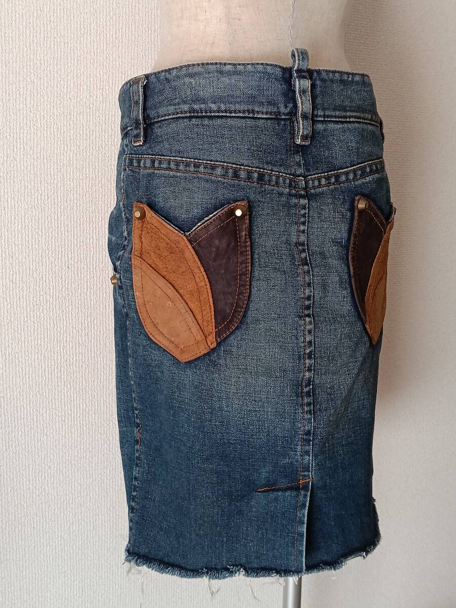 イタリア製 DSQUARED2 デニムスカート タイトスカート レザーパッチ レザーポケット ジーンズ ブルーデニム 膝丈スカート ペンシルスカート