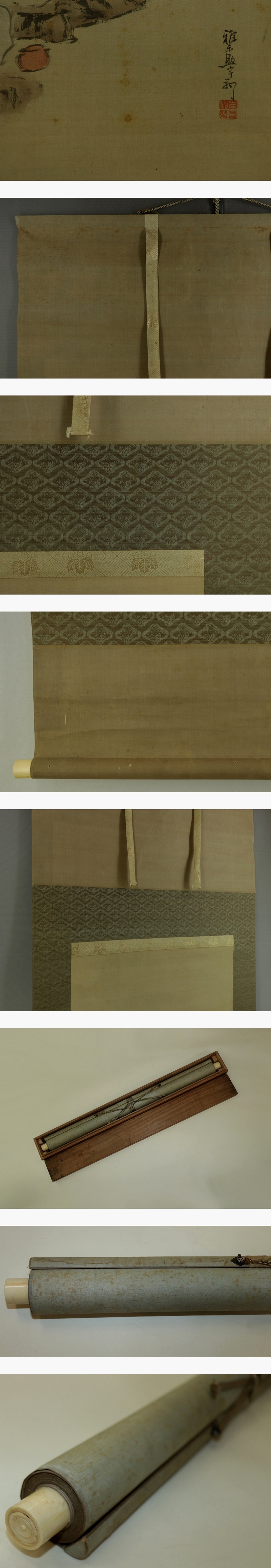岸駒 がんく(1756-1839) 江戸時代中期-後期の画家。 宝暦6年生まれ。岸派の祖。はじめ狩野派を,のち沈南蘋や円山派などの画風を学ぶ。 鳥獣,特に虎を得意とし,独自の画風を確立した。京都御所や金沢城の障壁画を制作。 天保9年12月5日死去。83歳。加賀(石川県)出身。 本姓は佐伯。名は駒,昌明。字は賁然。通称は雅楽助。号は華陽,蘭斎など。 作品に「老梅図襖」「虎に波図屏風」など。 本紙は、染み、汚れ、軽い折れ、軽い皺、ヤケがあります。 表装は、染み、汚れ、折れ、皺、ほつれ、擦れ、生地剥れがあります。 【サイズ】 作品 横約49cm×縦約109cm 表装 横約66cm×縦約193cm |