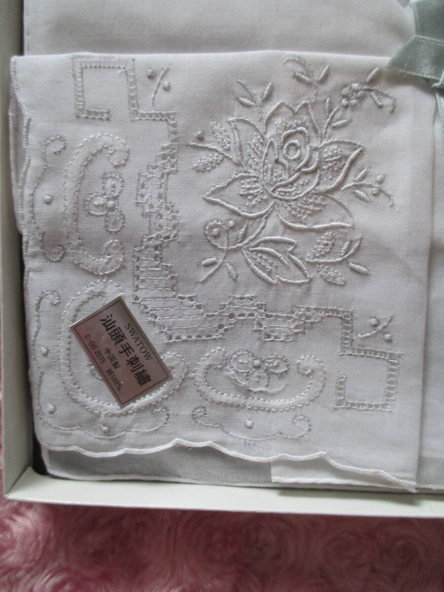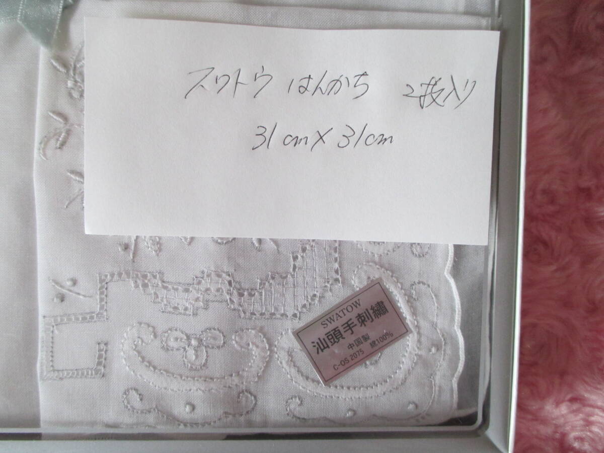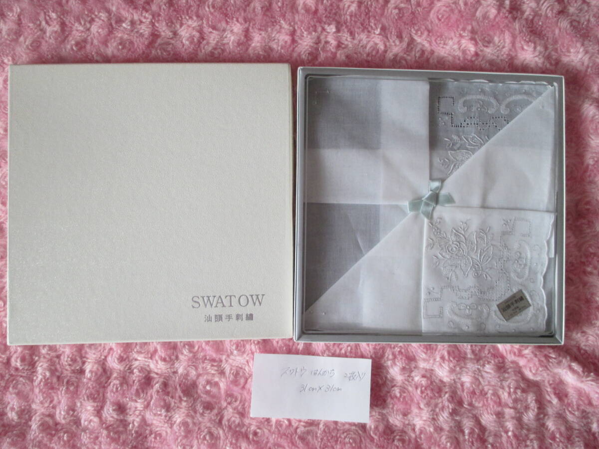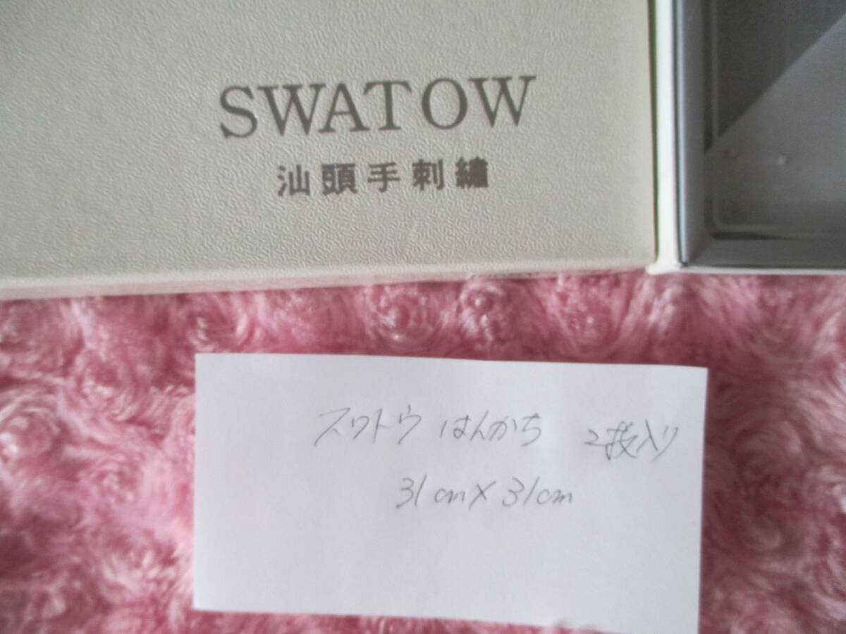 スワトウ SWATOW 手刺繍入り 中国製 綿100% 新品タグシール付き 箱入り 経年保管品 箱は多少スレや傷みがあります。サイズ約31×31cmほどの大きさのハンカチ 2枚セット 留め具がはずせなかったので中身の詳細なチェックはできておりません。
