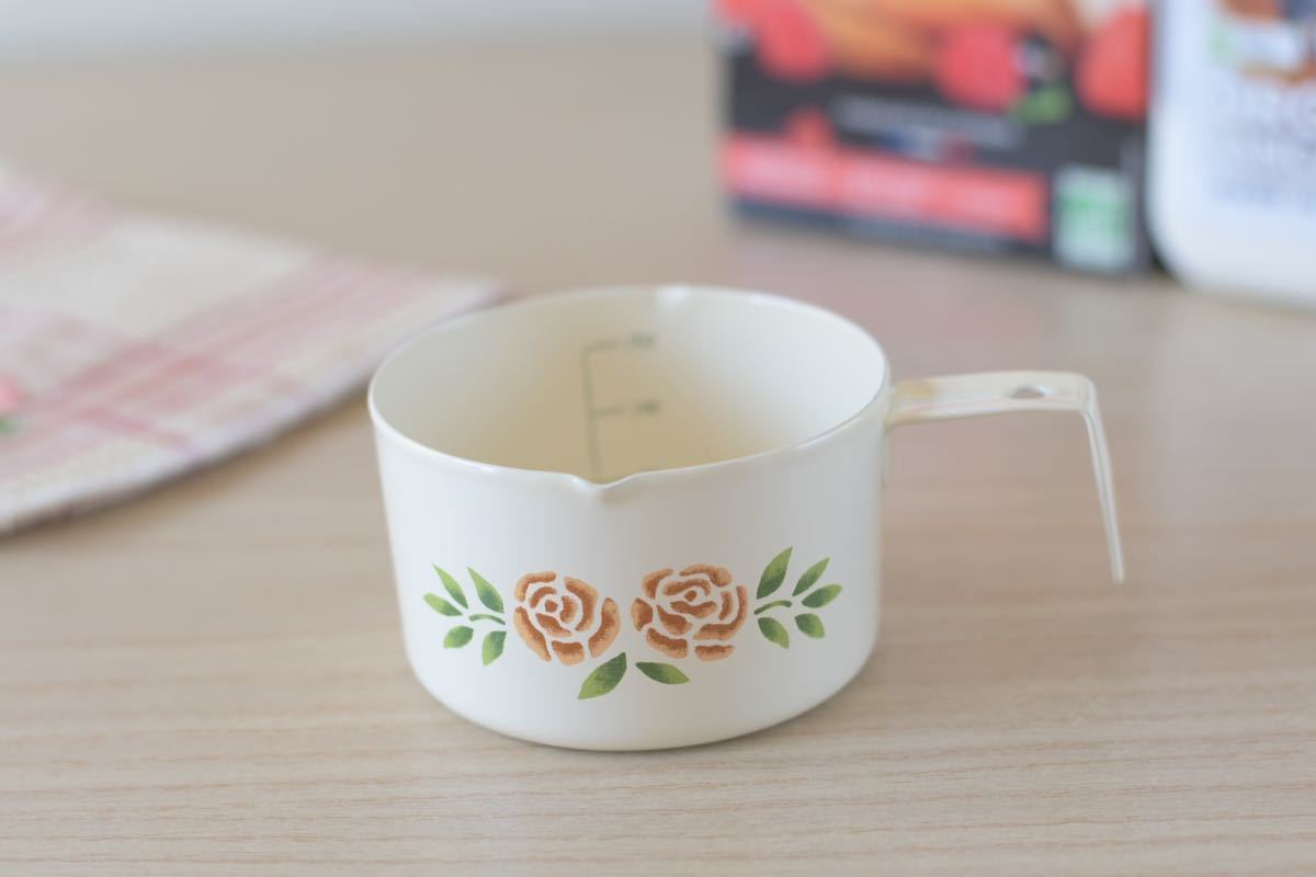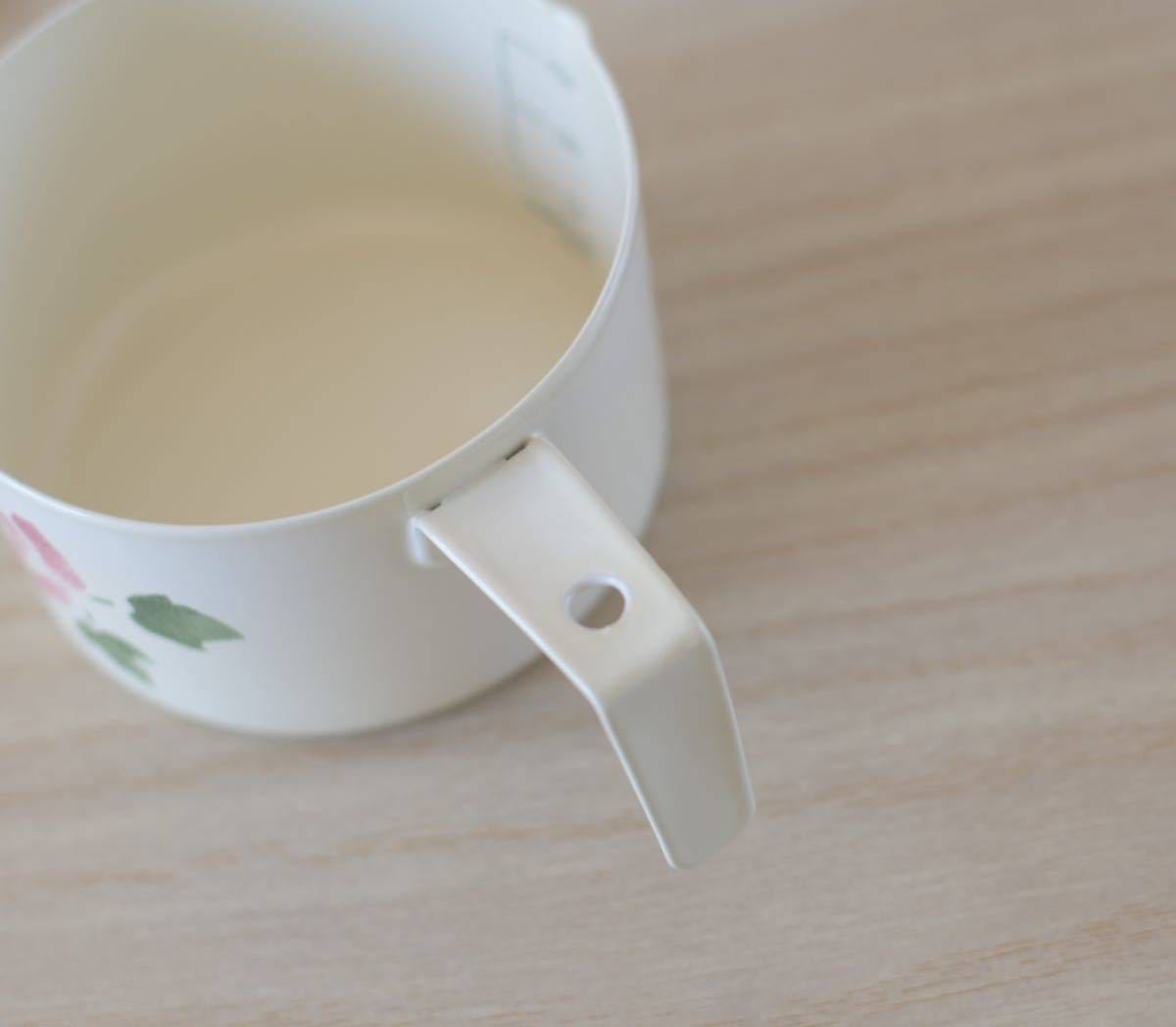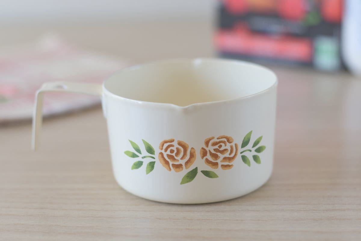 マニーステンシルローズ 可愛いホーローメジャーカップになります