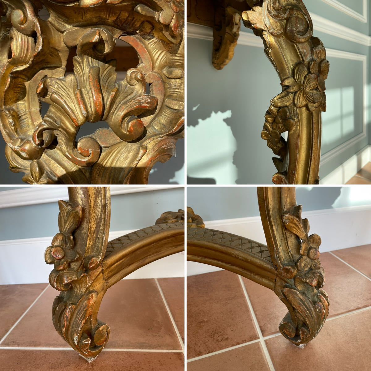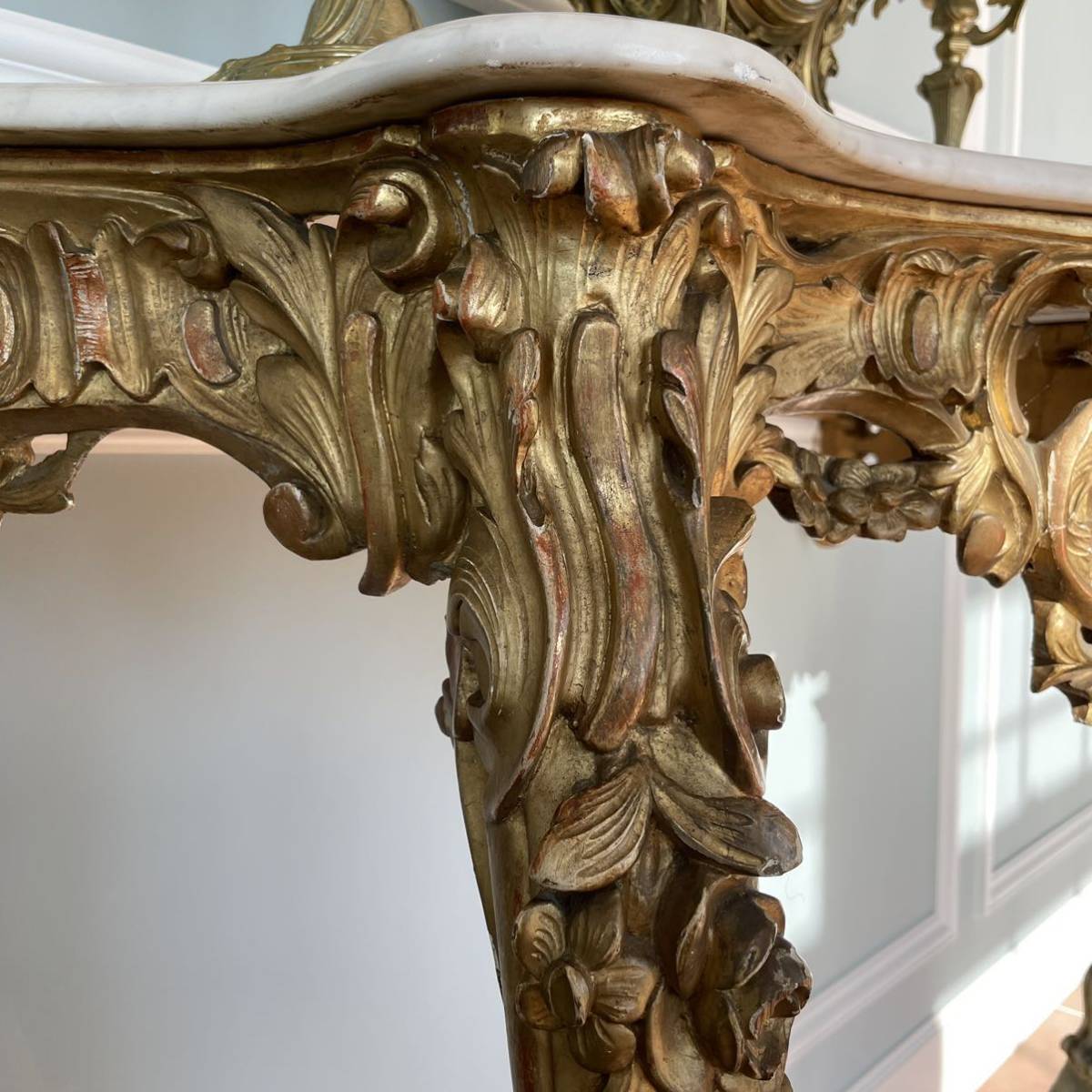 貴族の住まう煌びやかなロココ様式の室内に、圧倒的な存在感を放つこの金箔コンソールテーブルが設えていた情景が想起されます。
