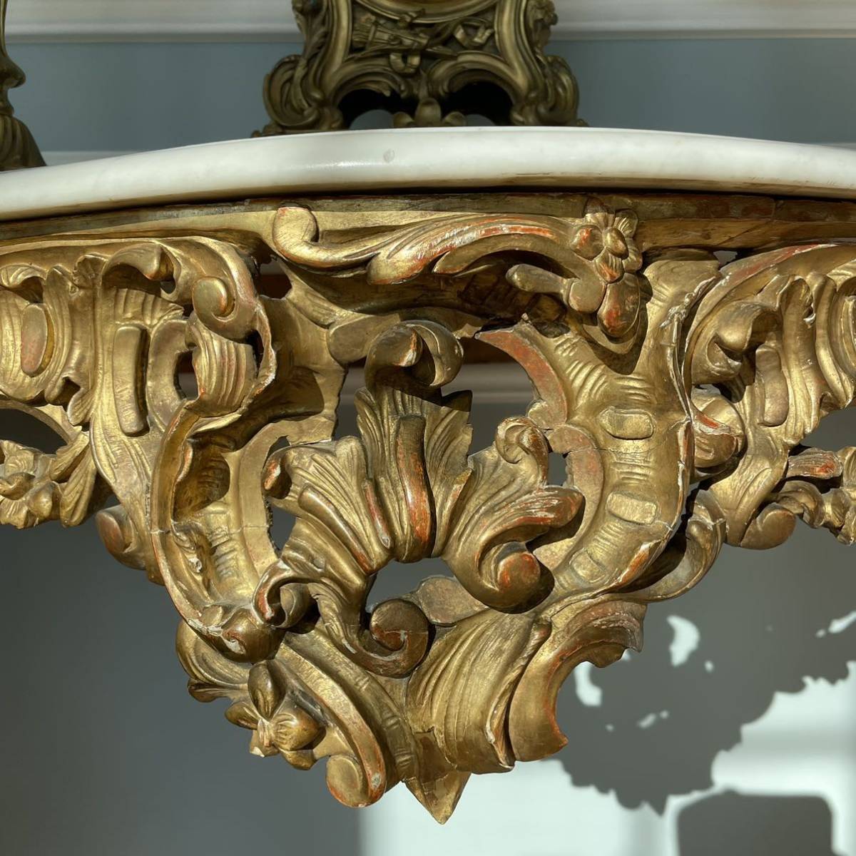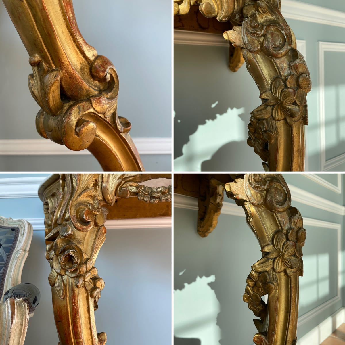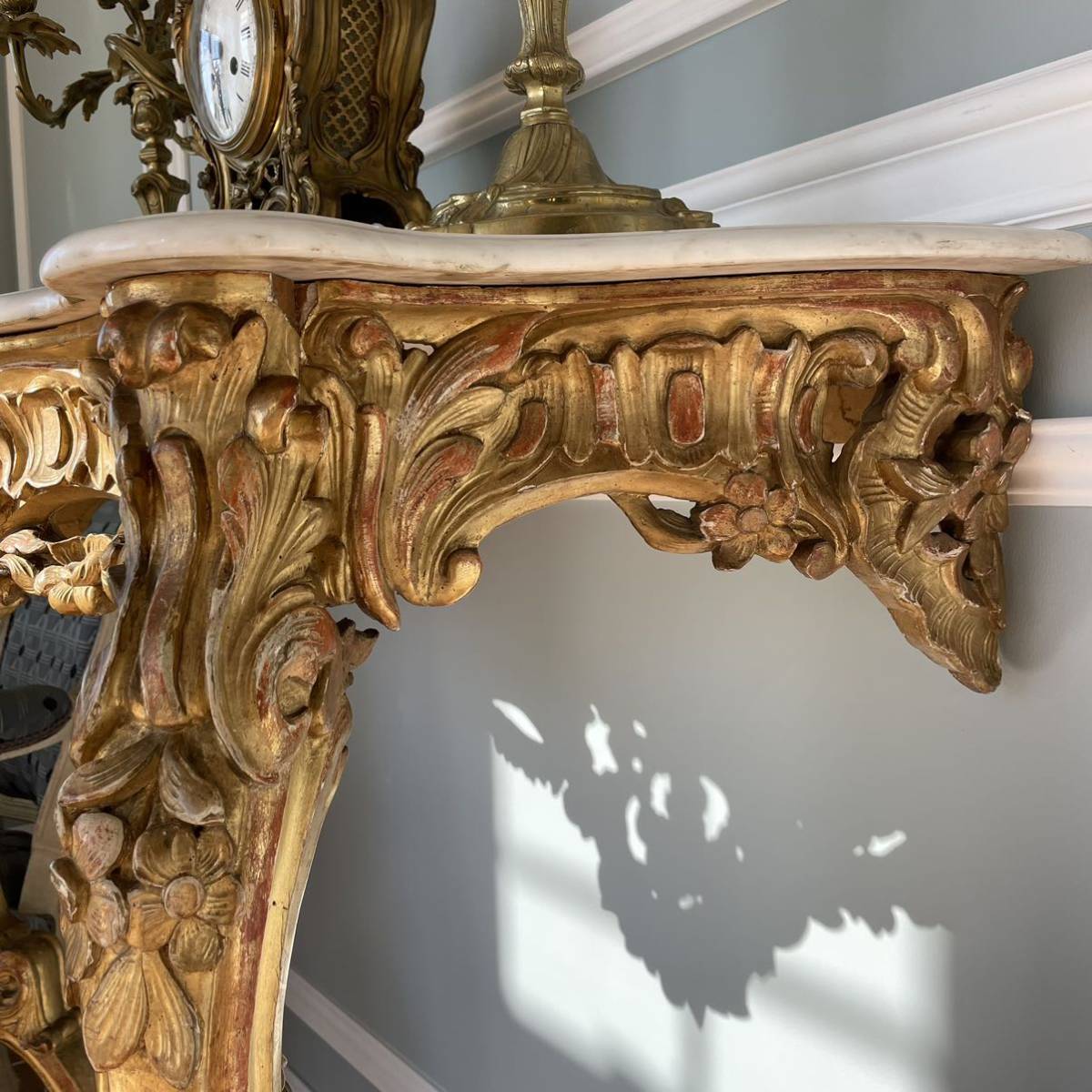 彫刻を施したウッドフレームに石膏を塗ってから金箔でメッキ加工が施されました。コンソールの上にはミラーがあり、キャンドルが飾られて。明かりの灯される夜にはサロンに飾られる曲線美の美しいコンソールが輝いていたことでしょう。