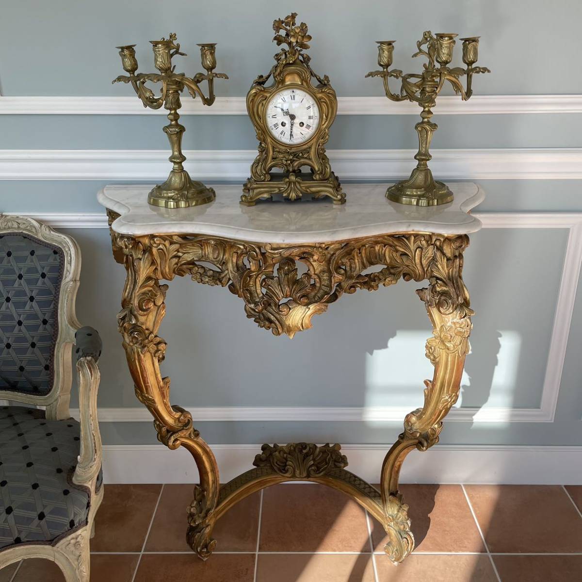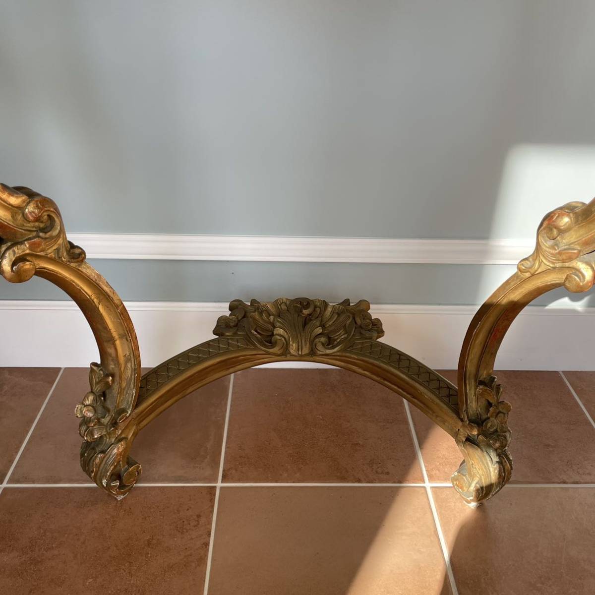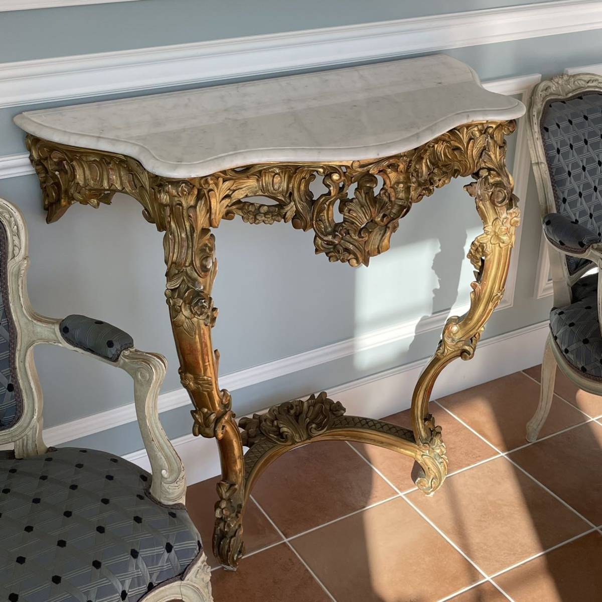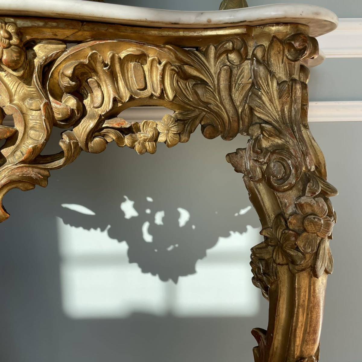 彫刻を施したウッドフレームに石膏を塗ってから金箔でメッキ加工が施されました。コンソールの上にはミラーがあり、キャンドルが飾られて。明かりの灯される夜にはサロンに飾られる曲線美の美しいコンソールが輝いていたことでしょう。