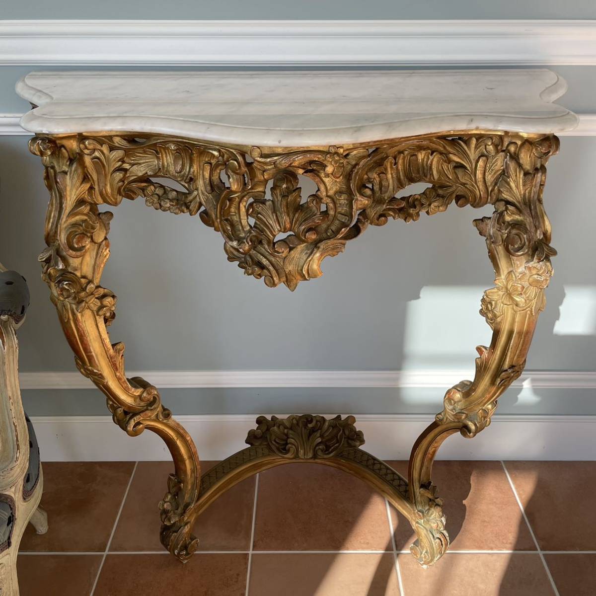 上部は白い高貴な印象の大理石。本体は足先まで貴族趣味のロカイユ、ガーランド、バラやマーガレットを繊細な彫刻で見事に表現しております。重い大理石をアカンサスなどの渦巻き装飾が施された2本の足が支え、そこには花々の連なった蔦が巻き付いて。