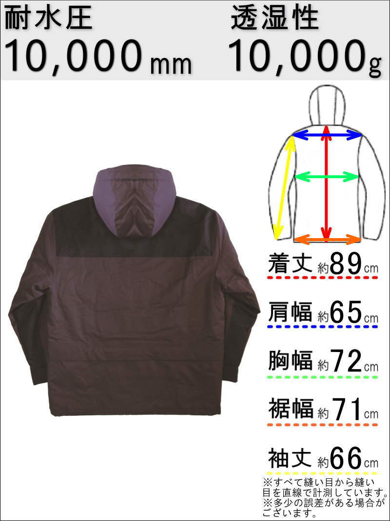 ・耐水圧:10,000mm ・透湿性:10,000g ・2レイヤー素材 ・ストレッチあり ・撥水加工仕上げ ・ウェストのパウダーガード:なし ・手首部分のカフ:なし ・脇の下のベンチレーション:あり ・パスケース:なし ・生地の厚さ:やや厚い |